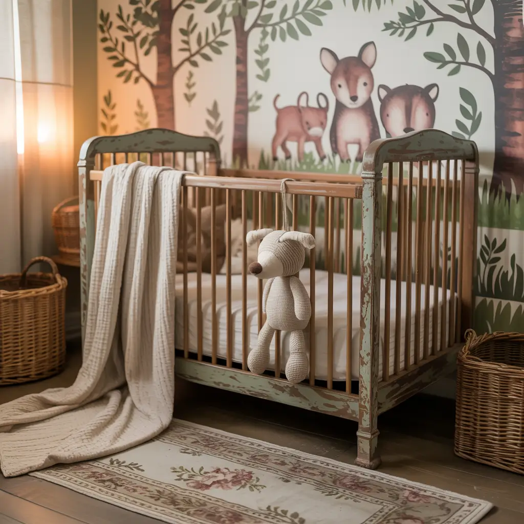 Ever notice how vintage woodland nurseries feel instantly cozy? The combination of aged wood and nature creates this grounding energy that modern furniture just can’t replicate.