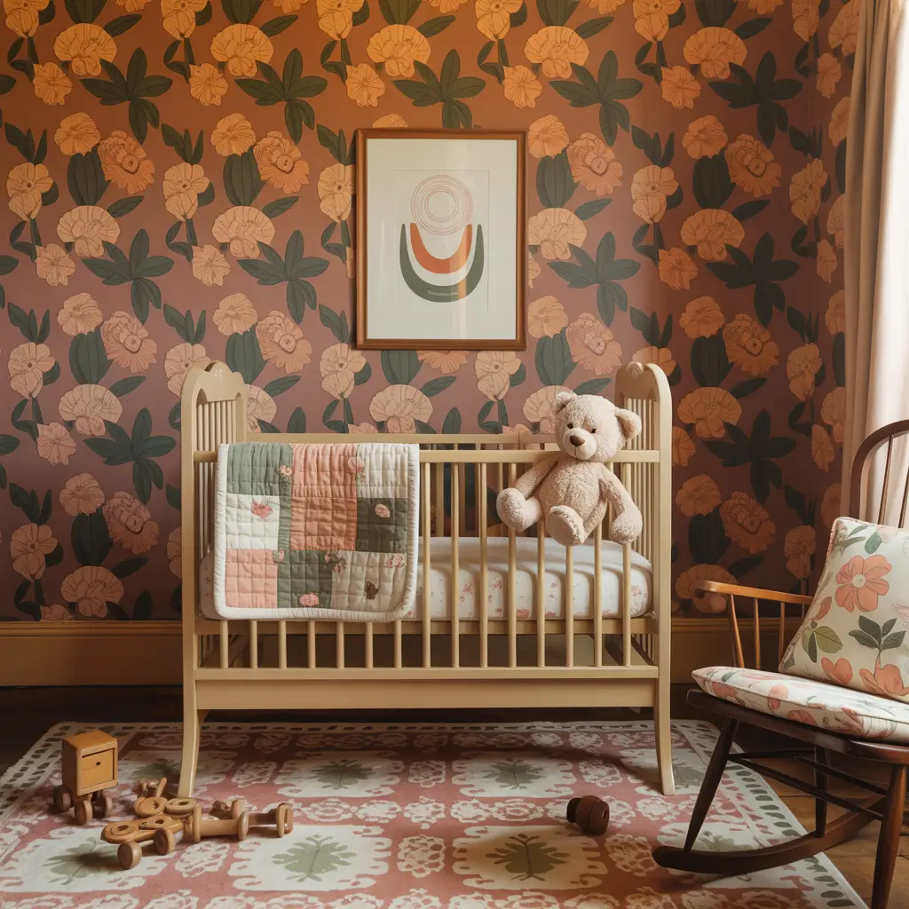 Retro floral nurseries take those bold, vintage flower patterns from the ’60s and ’70s and make them work for today. This isn’t your grandmother’s dusty rose garden – think big, bold blooms with serious vintage attitude. I went full retro floral for my friend’s nursery, and it’s basically a groovy time capsule.
