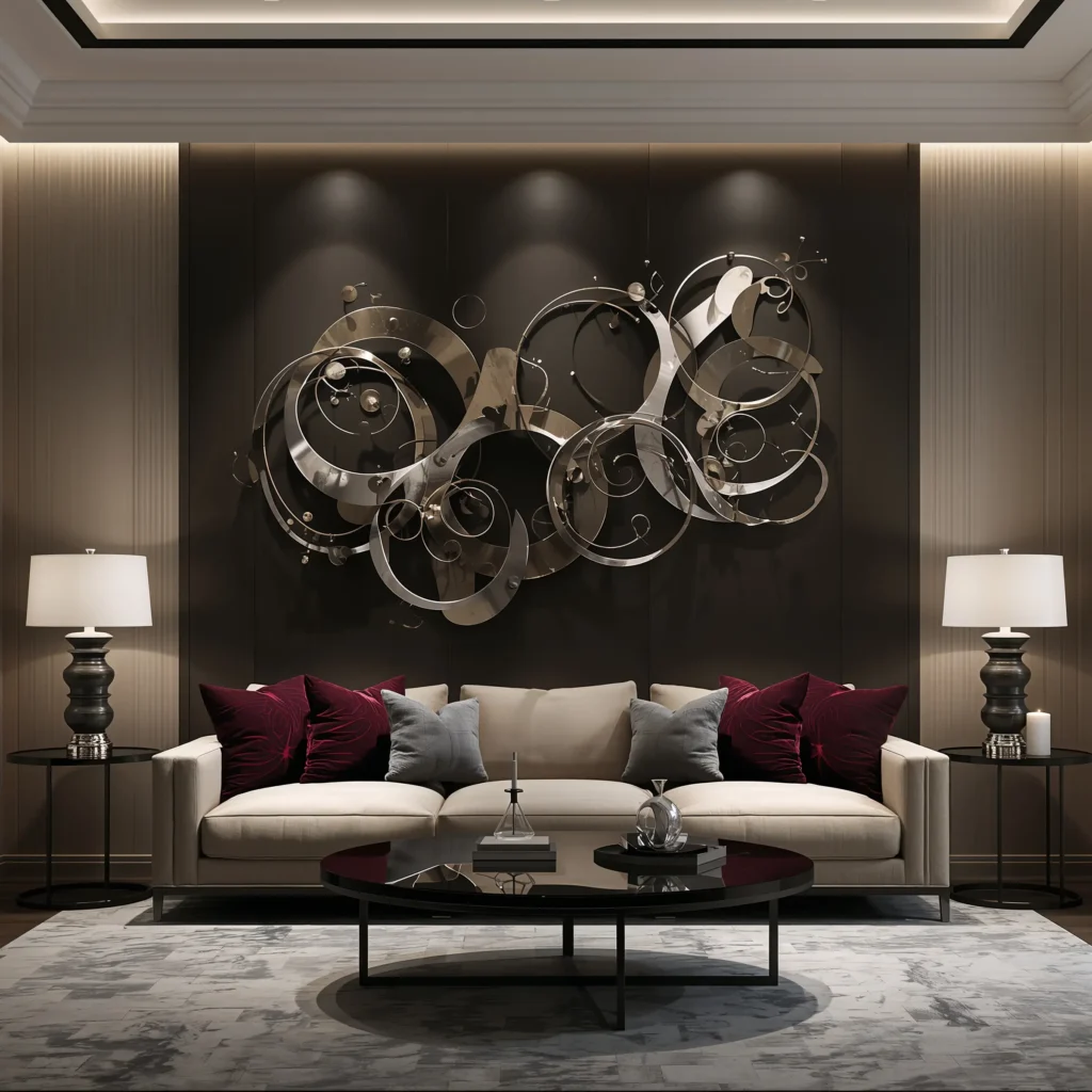 Metal wall sculptures bring that gallery-quality edge to your living room. These three-dimensional pieces cast interesting shadows and change appearance as light moves throughout the day.