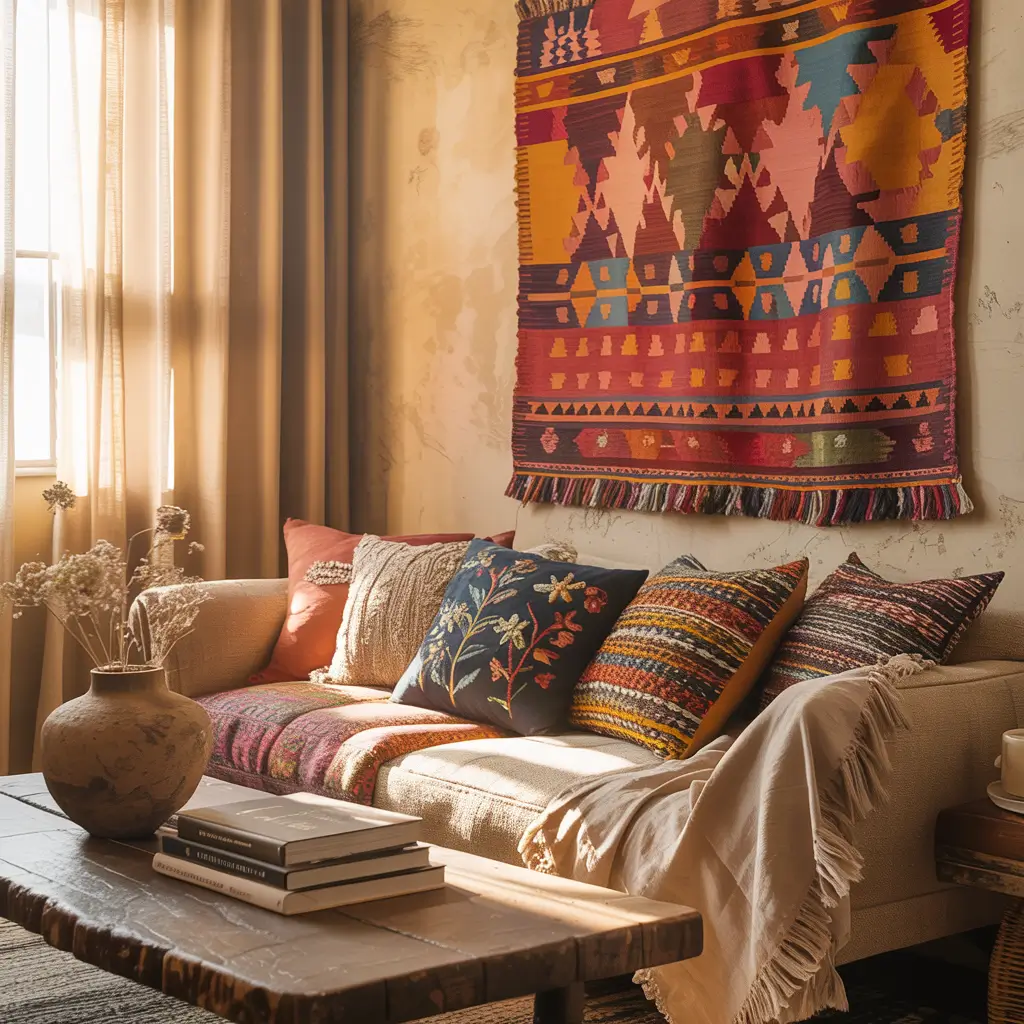 I hung a large woven piece above my sofa after getting tired of trying to fill the space with smaller art. The texture adds depth, the pattern brings interest, and the softness balances all my room’s hard edges. Plus, they’re lightweight and easy to swap out seasonally.