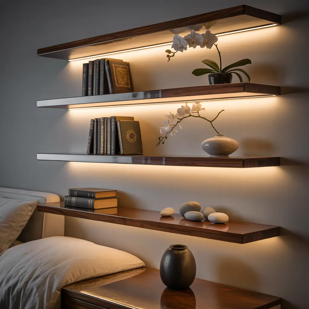 The ambiance factor can’t be overstated. These shelves provide both storage and mood lighting. Evening dinner parties are instantly more sophisticated when your walls are softly glowing. It’s like Instagram filters but for real life.