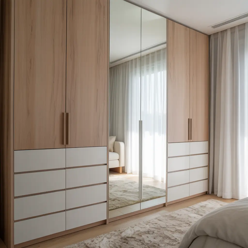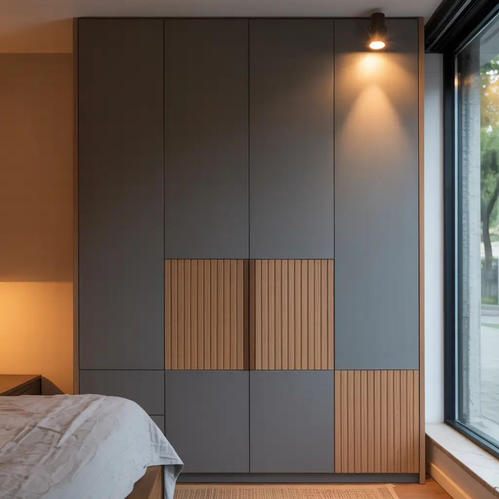 I experimented with charcoal gray and light oak on my wardrobe – the contrast defines different storage zones while maintaining cohesion. Dark bottom sections ground the design, while lighter upper portions keep things airy.