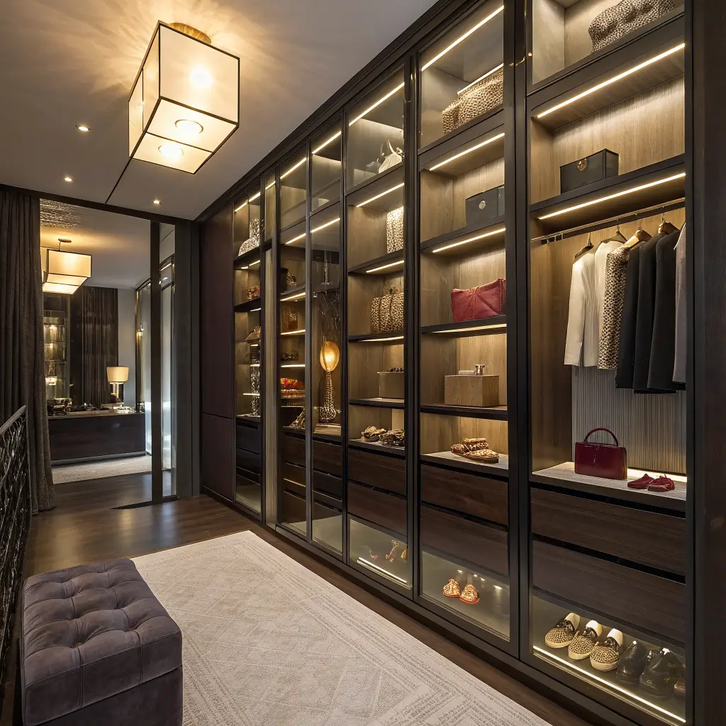 Display becomes part of the design with luxury interiors. Glass-front drawers for watches and accessories, open shelving for handbags, LED strips highlighting your shoe collection – it’s about creating a space that celebrates your wardrobe rather than just storing it.