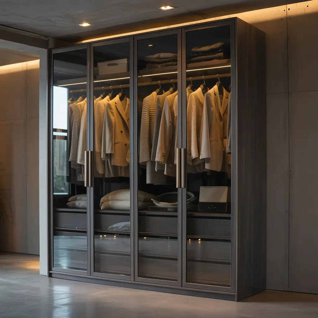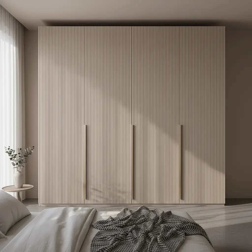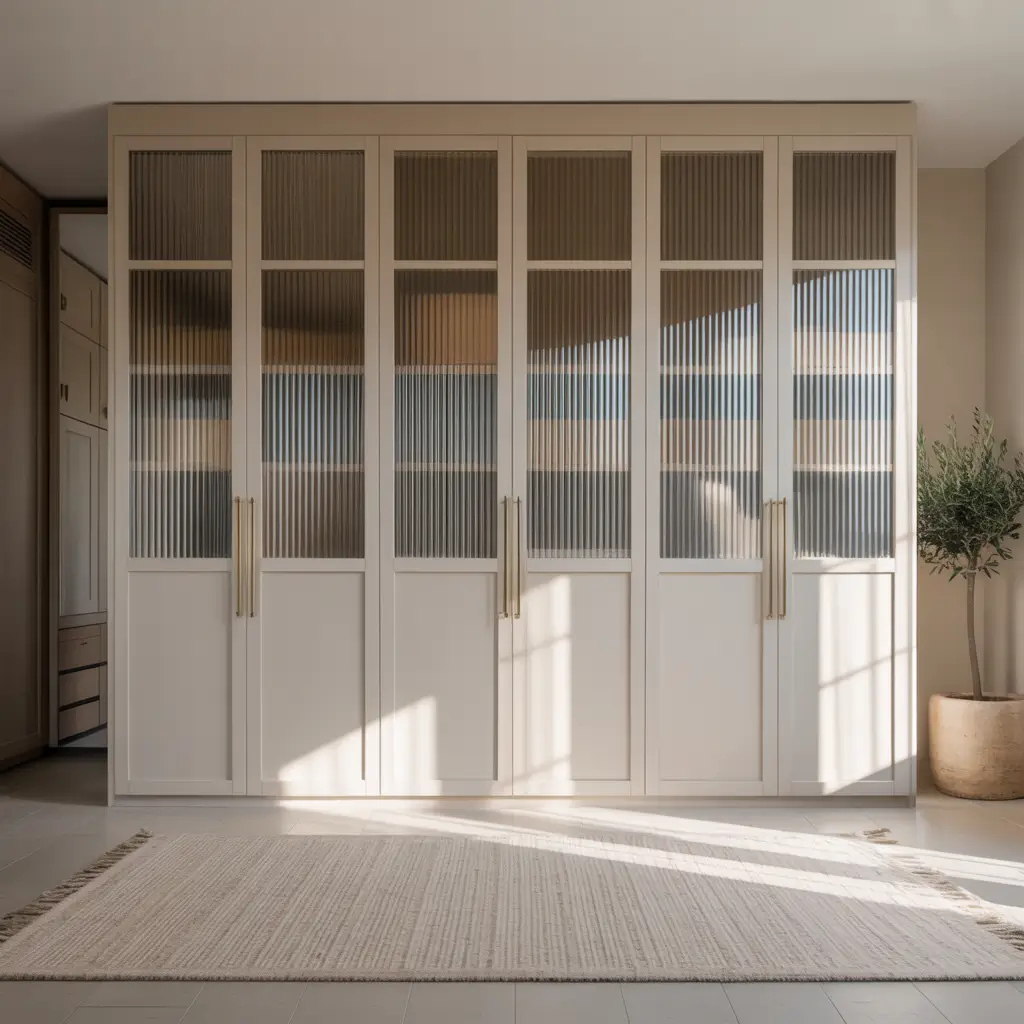 Remember when everyone thought glass wardrobes would show all your clutter? Well, fluted glass just laughed at that concern and became the coolest kid on the block. These vertical ridged glass panels blur everything behind them while still letting light dance through your room.