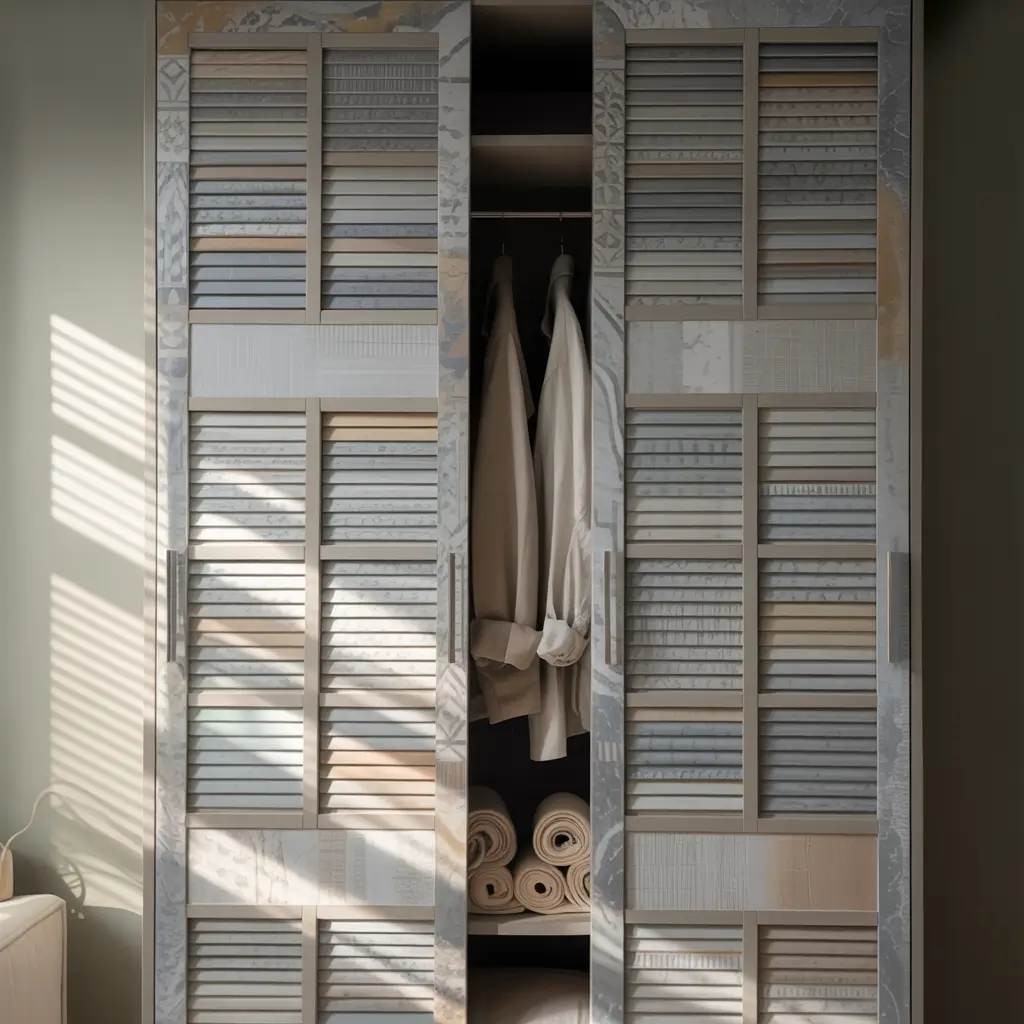 Let’s get one thing straight – louvered shutters aren’t just for beach houses anymore. These slatted beauties bring texture and visual interest that flat panels could never achieve. Plus, they solve that eternal wardrobe problem: ventilation.