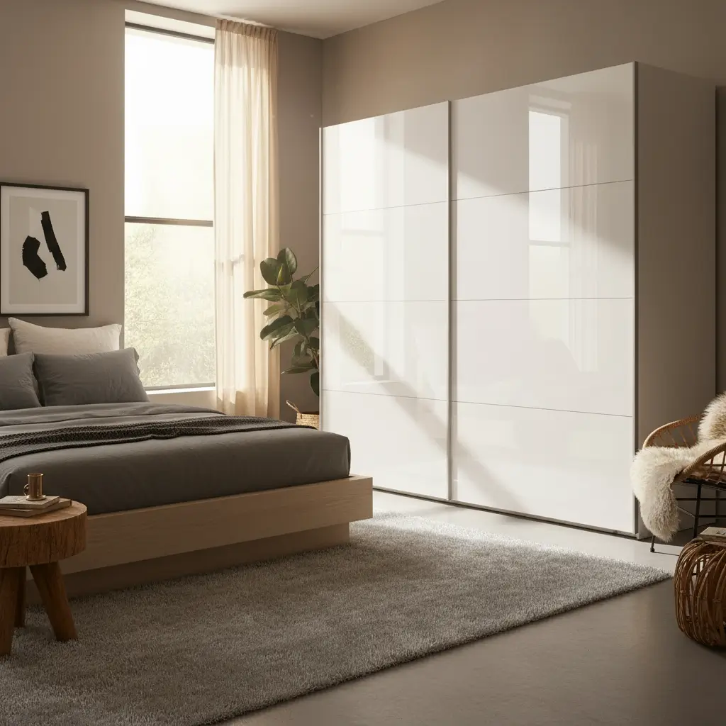Okay, I know I praised matte earlier, but hear me out – high-gloss sliding shutters turn your wardrobe into a glamorous statement piece. When done right, they’re like having a piece of liquid luxury in your bedroom.
