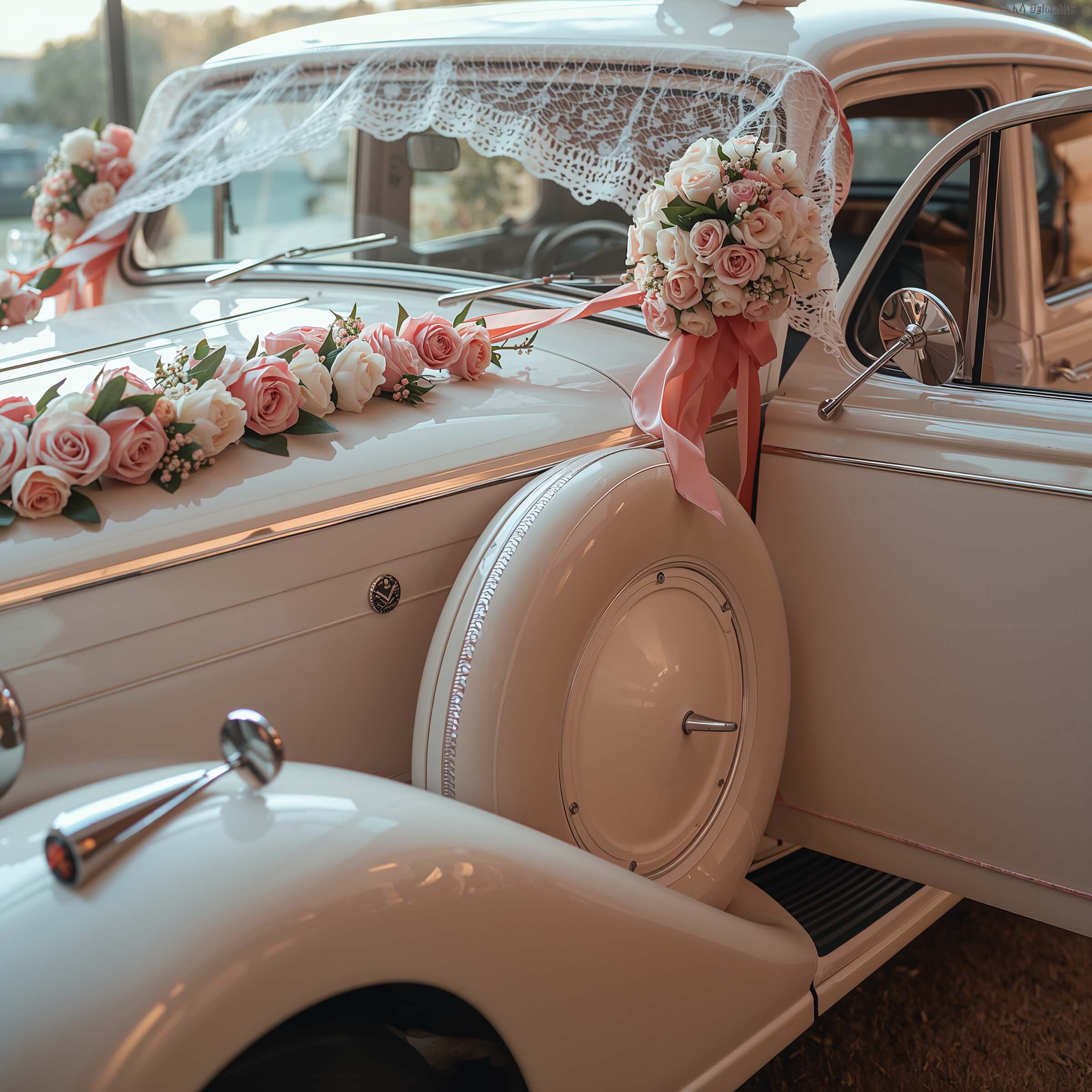 Sometimes the most elegant solutions are also the simplest. Ribbon and lace decorations offer timeless romance without overwhelming your car’s natural lines. This approach works particularly well if you’re driving a classic or vintage vehicle that already has inherent beauty.
