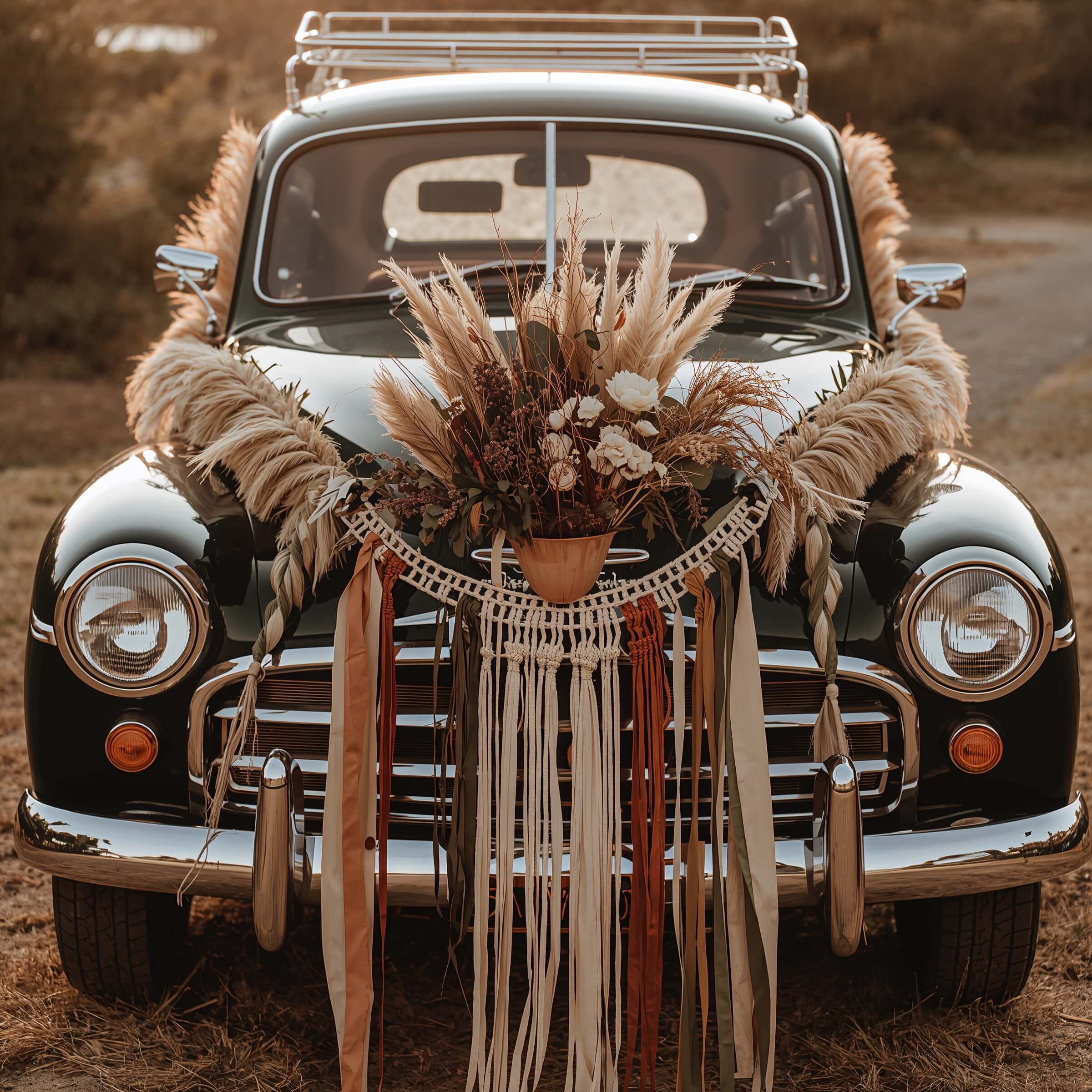 Free-spirited, artistic, and effortlessly cool—boho chic car decor captures that laid-back luxury vibe perfectly. This style works beautifully for outdoor weddings, beach ceremonies, or any celebration where you want to embrace natural beauty with artistic flair.