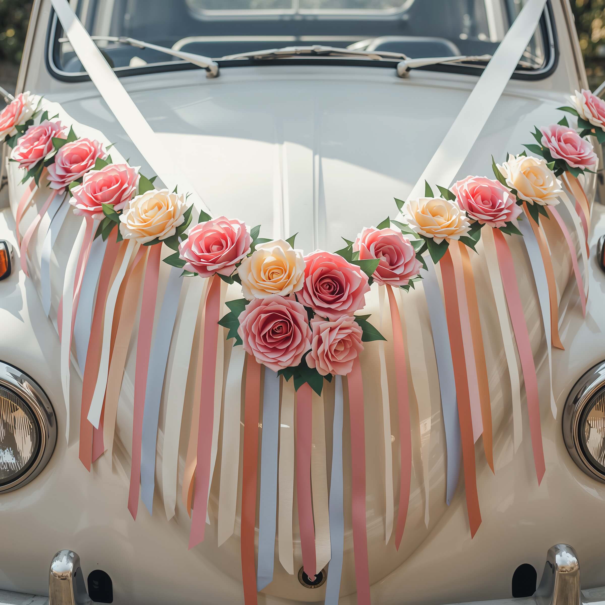 Remember, your car decorations will appear in countless photos, so choosing colors that complement your overall wedding aesthetic ensures everything looks intentional and beautiful together.