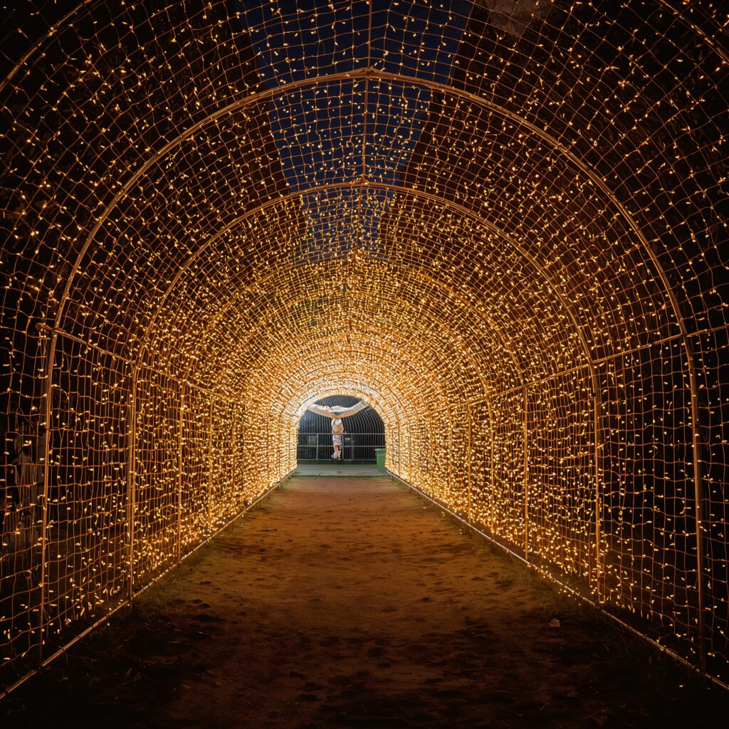 The structure supporting your lights needs serious consideration too. Chicken wire tunnels look exactly as elegant as they sound (spoiler: they don’t). Invest in proper framework – whether that’s a rental tunnel structure or custom-built archways.