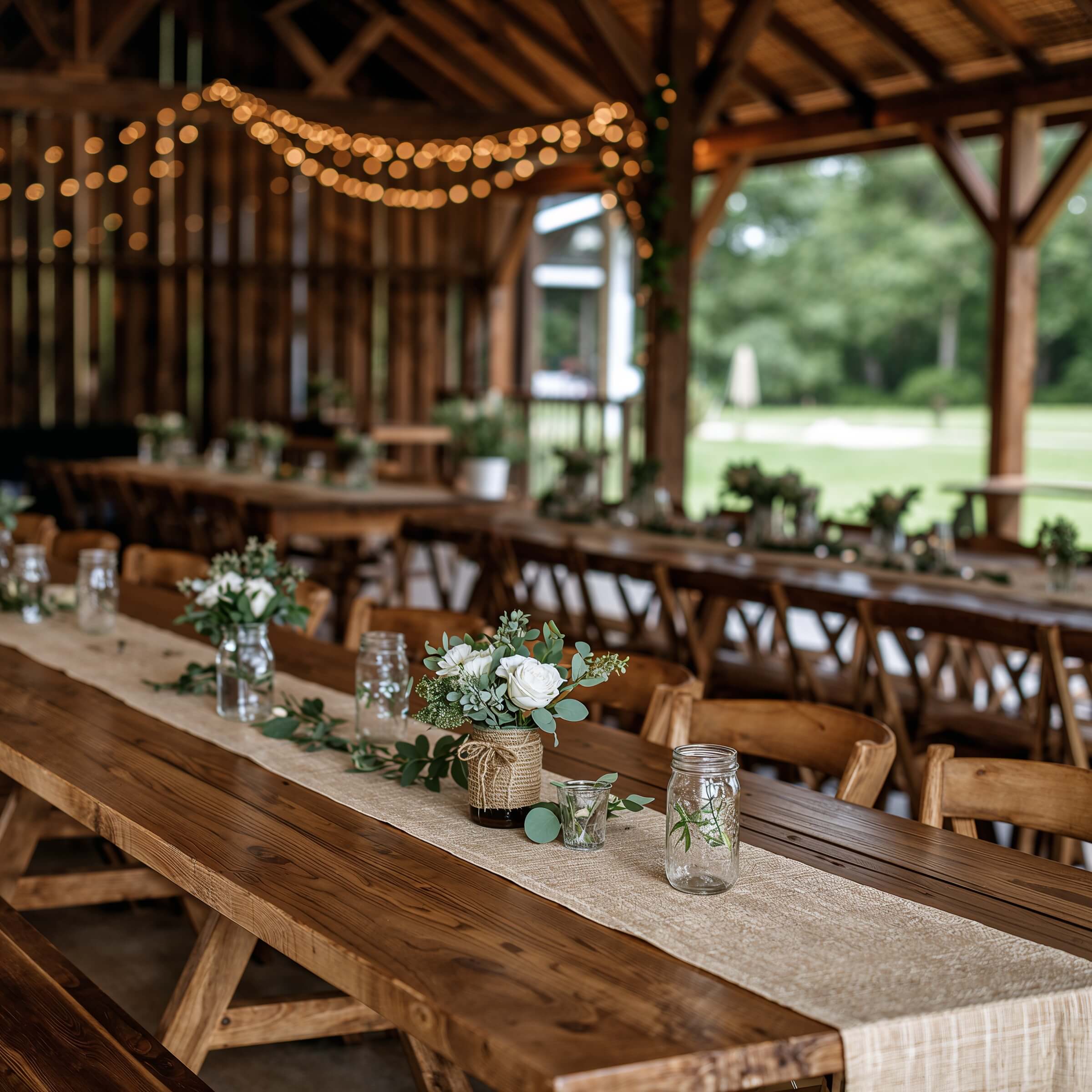 - Wooden farm tables (rent them if buying isn’t feasible)