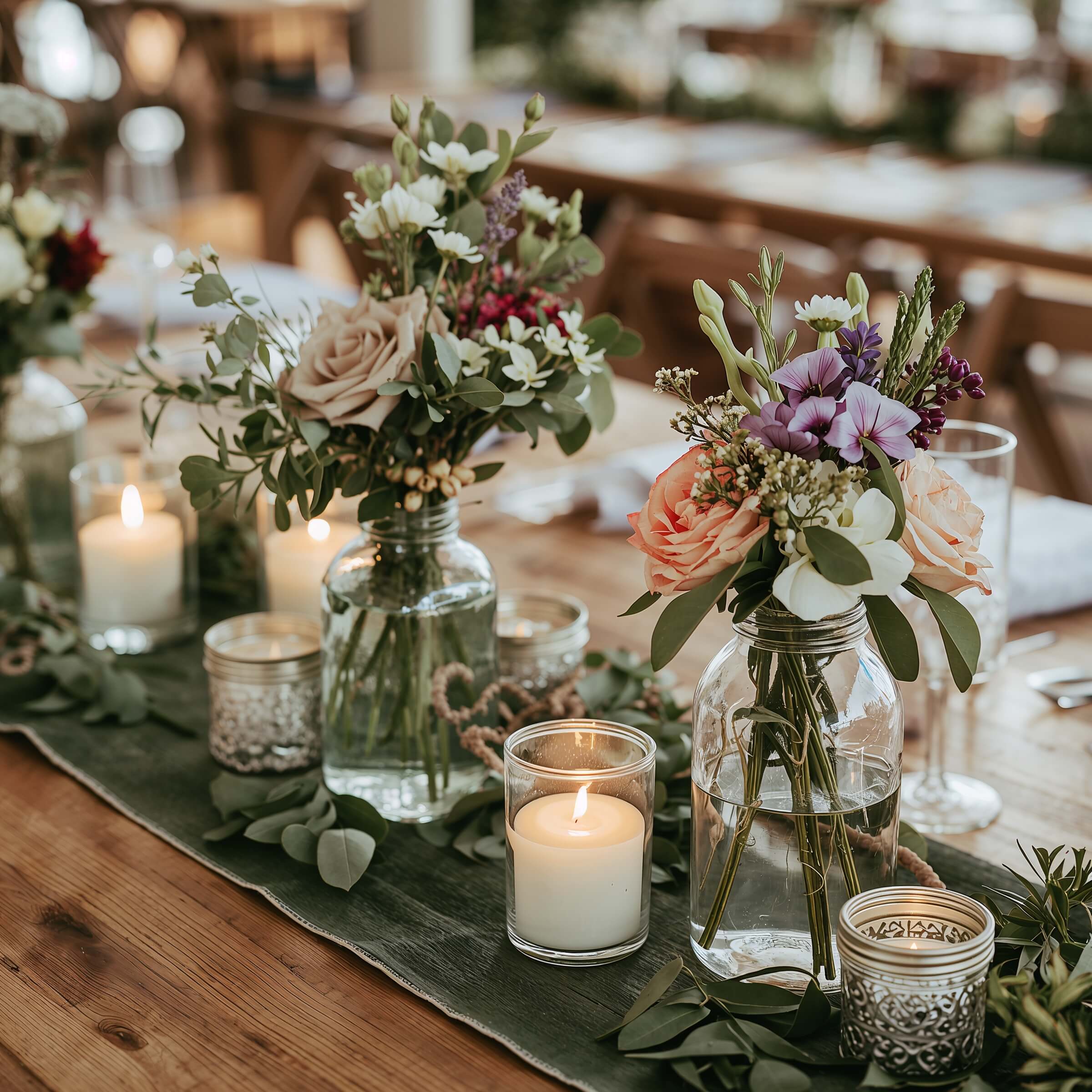 - Mason jar centerpieces with baby’s breath and lavender