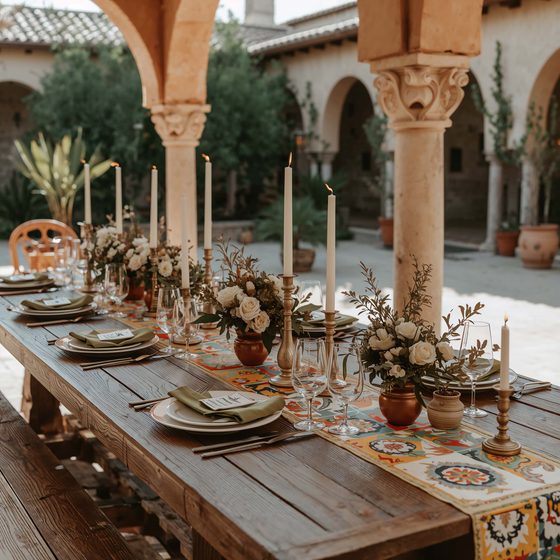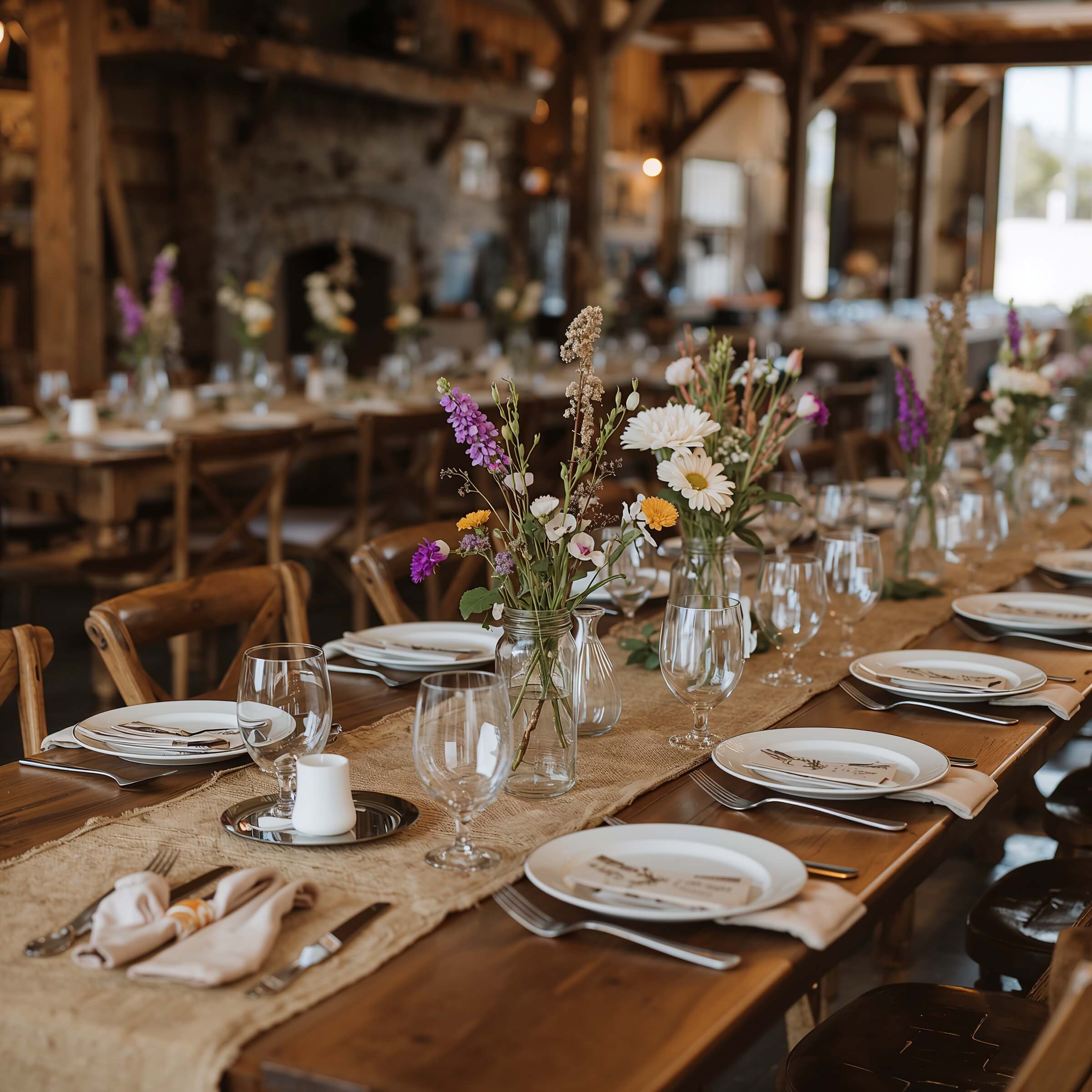 Start with wooden farm tables if your venue has them. No luck? Transform regular tables with wood-grain table runners or rent wooden charger plates. The texture immediately changes everything. Layer your table settings with: