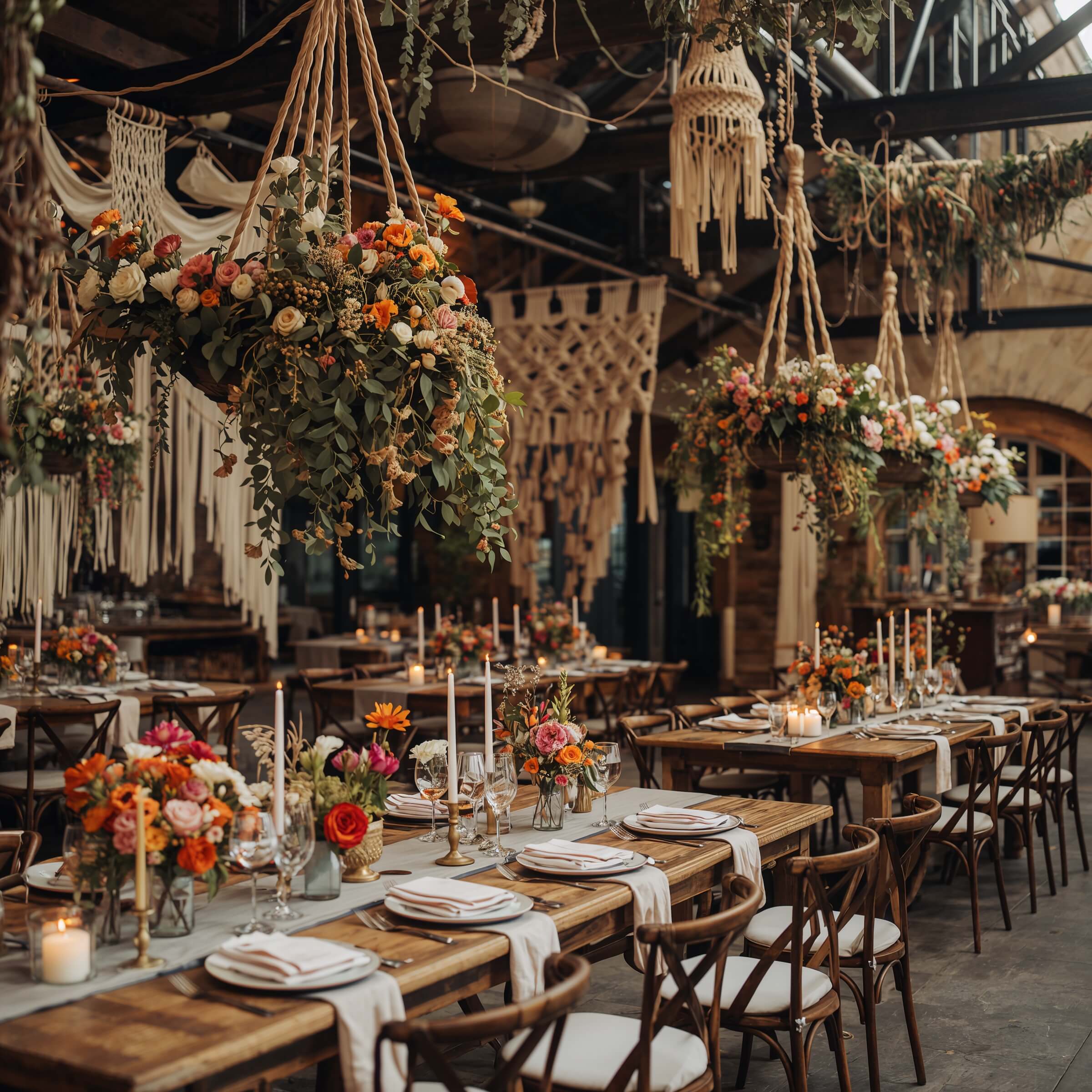 Macramé chandeliers adorned with flowers make stunning focal points. Hang them at different heights over the dance floor or sweetheart table. Not crafty? No problem. You can rent or buy pre-made macramé pieces and just add florals.