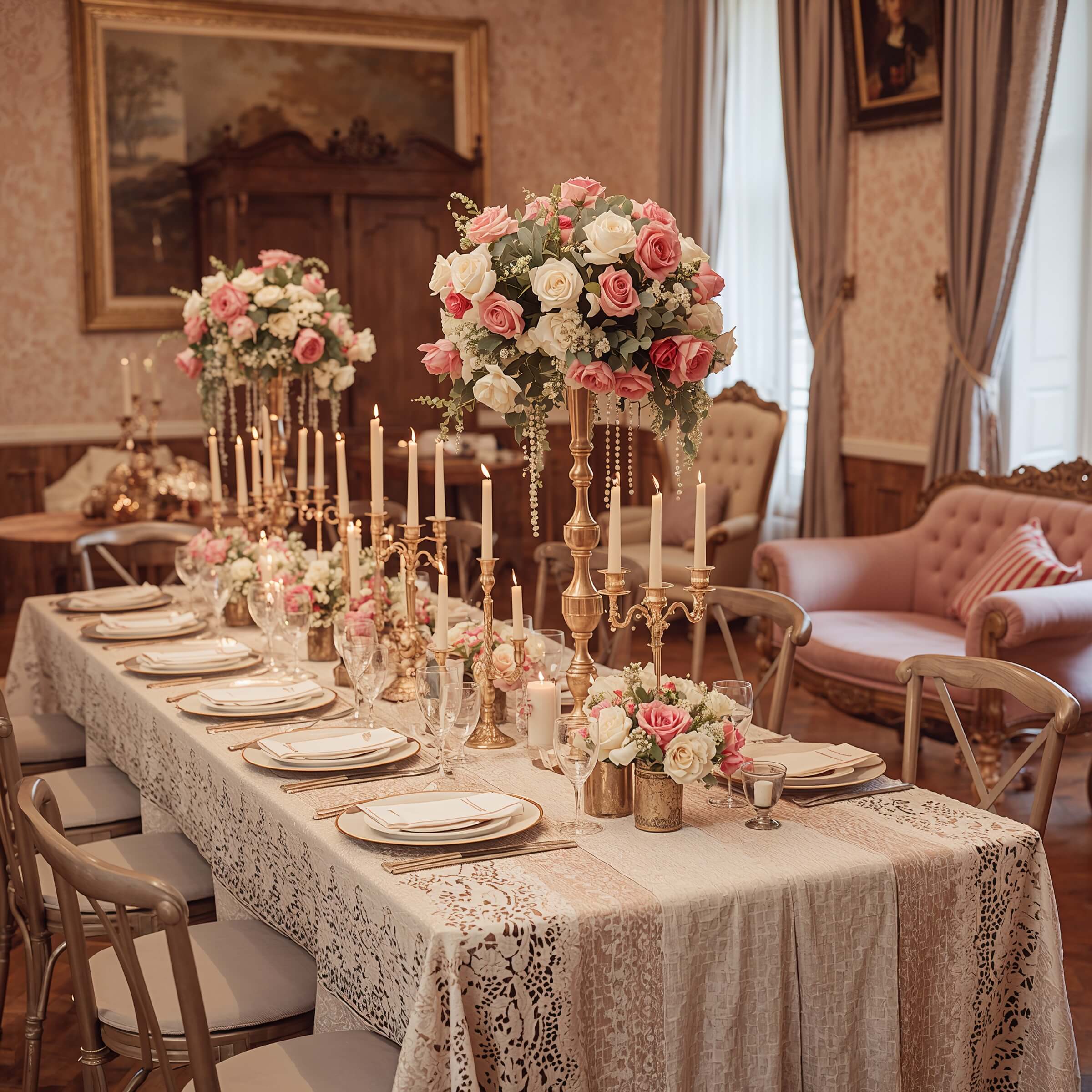 Use lace as an overlay on cocktail tables or as runners down farm tables. Hang lace panels as backdrops or room dividers. But here’s the key: mix different lace patterns for visual interest. All matching lace looks costume-y.