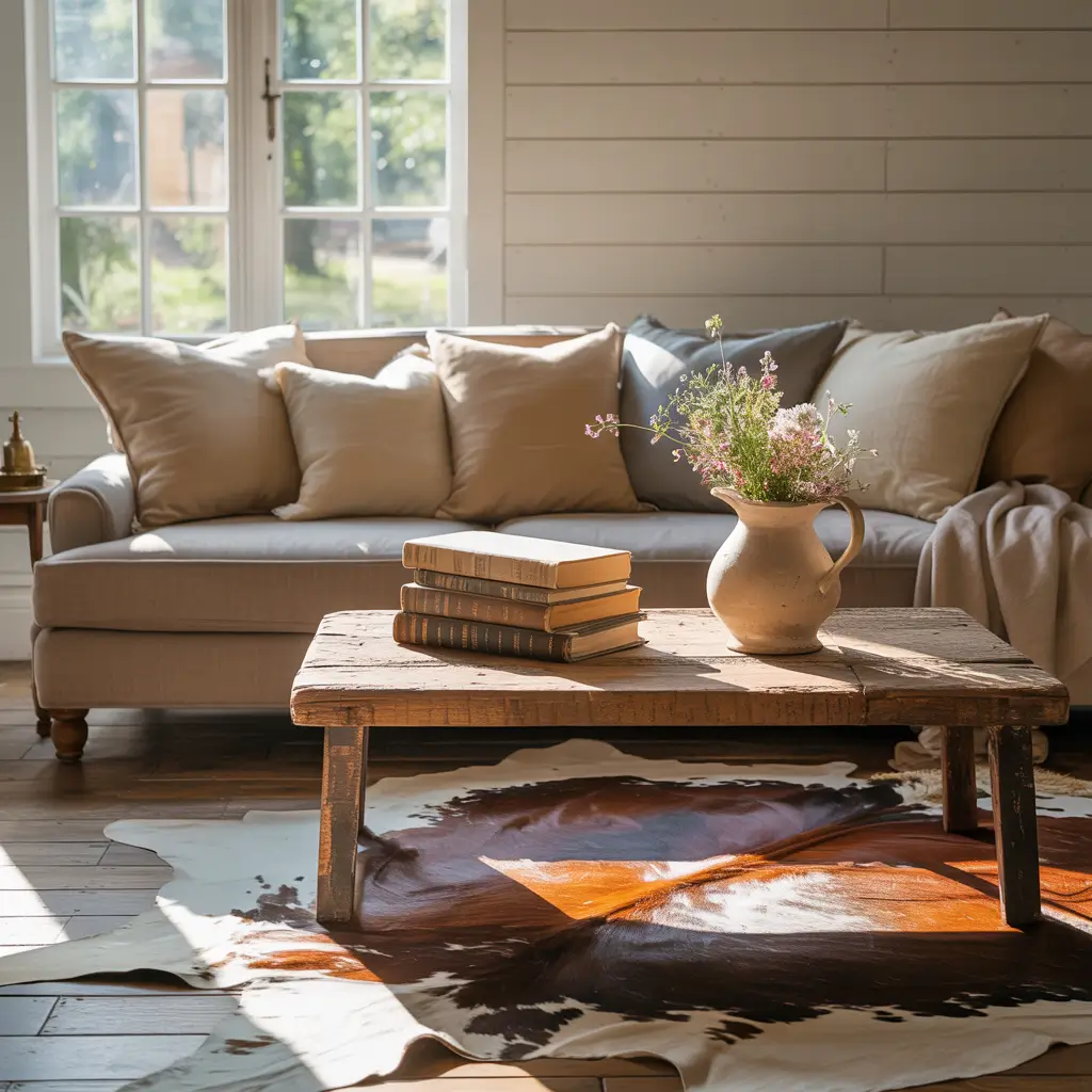 Here’s what transformed my space: layering a cowhide rug over a larger jute rug. The jute defines the seating area and adds warmth underfoot. The cowhide brings pattern and western flair. Together they create dimension that a single rug never achieves.