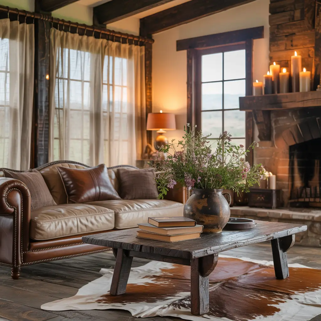 The fireplace mantel deserves attention too. Keep it minimal but meaningful – maybe a vintage mirror, some iron candlesticks, and one piece of western art. My mantel holds only three things: a large wooden frame, two iron lanterns, and seasonal greenery. Less really is more here.