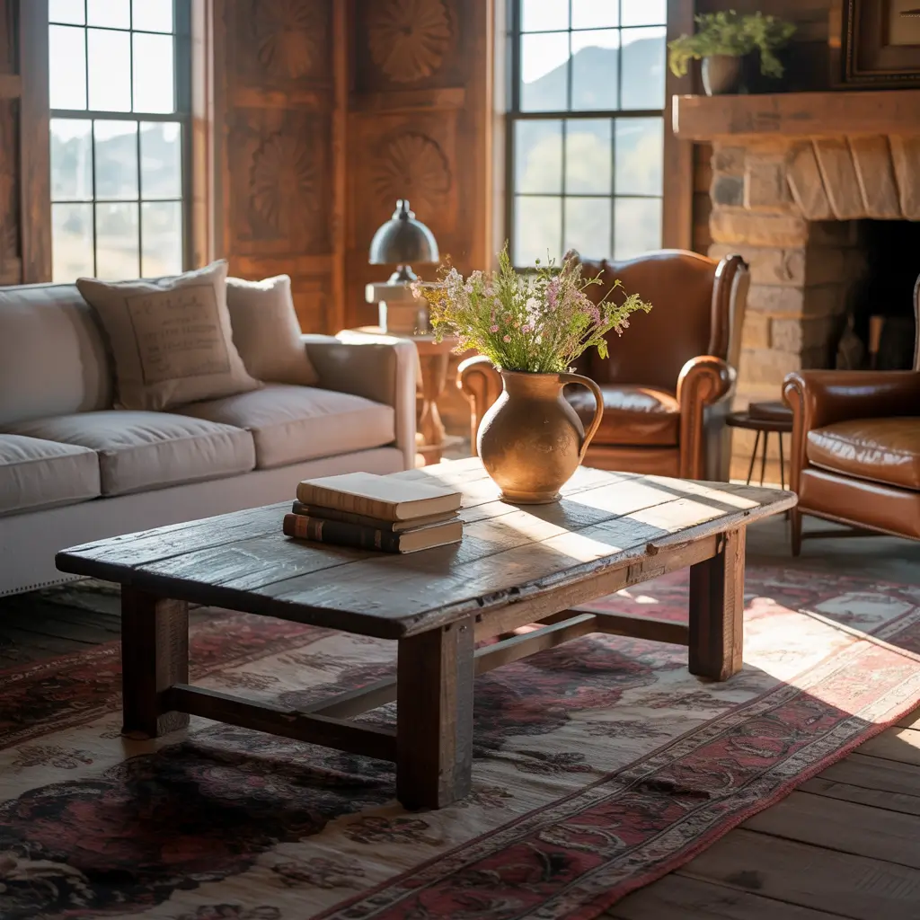 Your coffee table in a western farmhouse living room should look like it survived a few decades on an actual ranch. Reclaimed wood brings instant authenticity and character that new furniture simply cannot match.