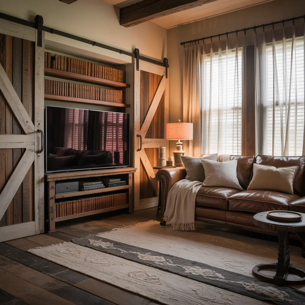 I built a barn door entertainment center for under $300 using sliding door hardware from Amazon and reclaimed wood planks from a salvage yard. The door slides to reveal the TV when needed, hides it when you want that authentic farmhouse look. Best of both worlds, IMO.