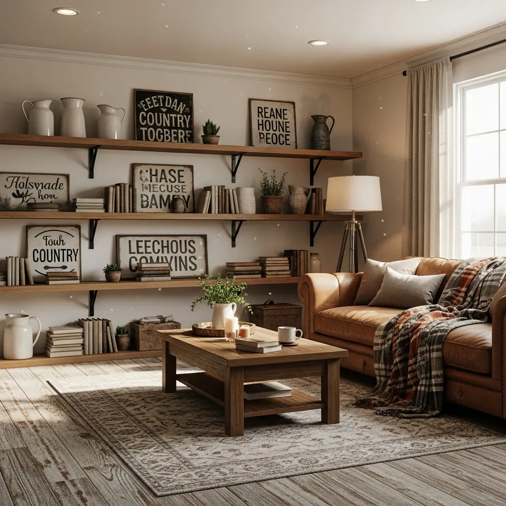Open shelving in western farmhouse living rooms displays your carefully curated collection of rustic finds while providing actual storage. The key is styling shelves that look collected over time rather than bought in one Hobby Lobby shopping spree.