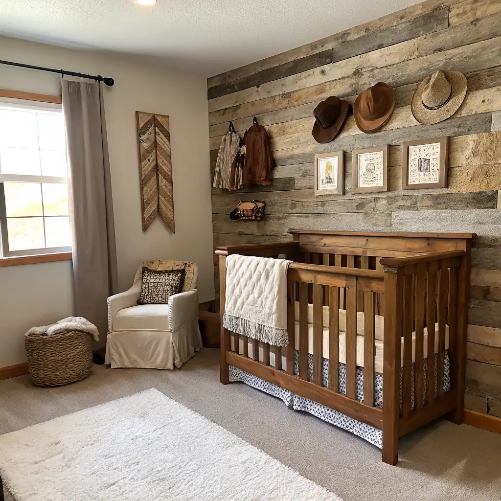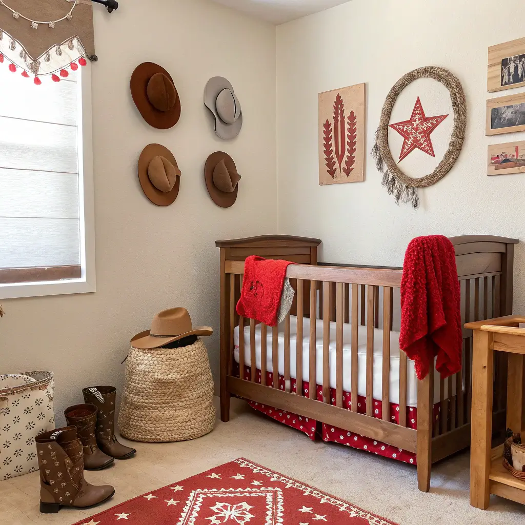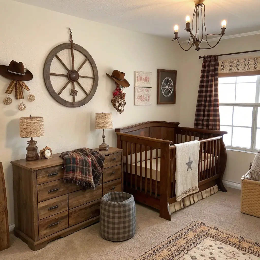 The key to nailing rustic cowboy? Mix authentic western elements with modern comfort. That vintage saddle looks amazing, but your baby needs an actual crib, not a hay bale.