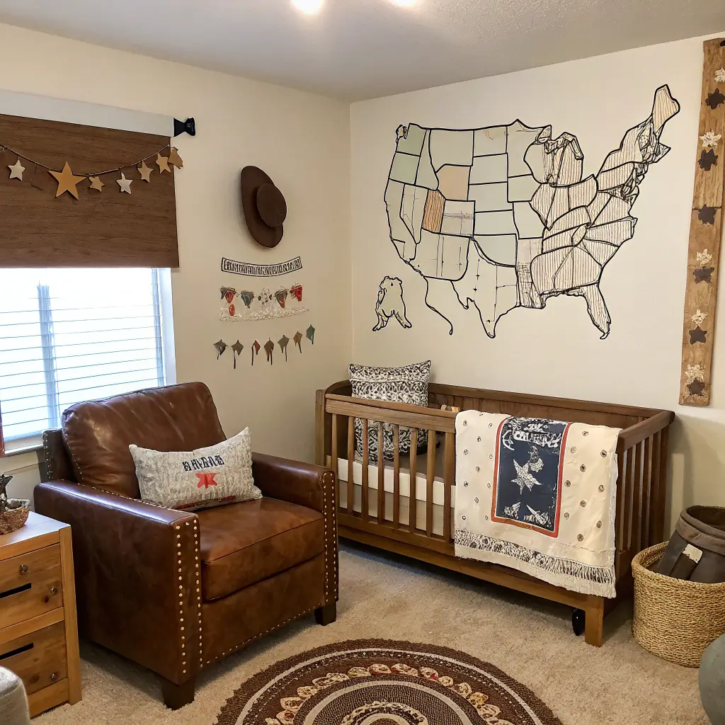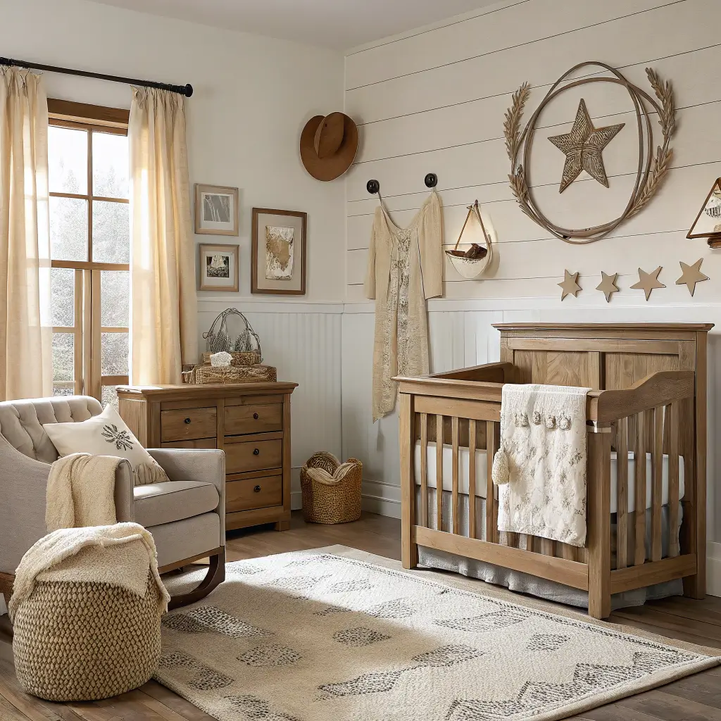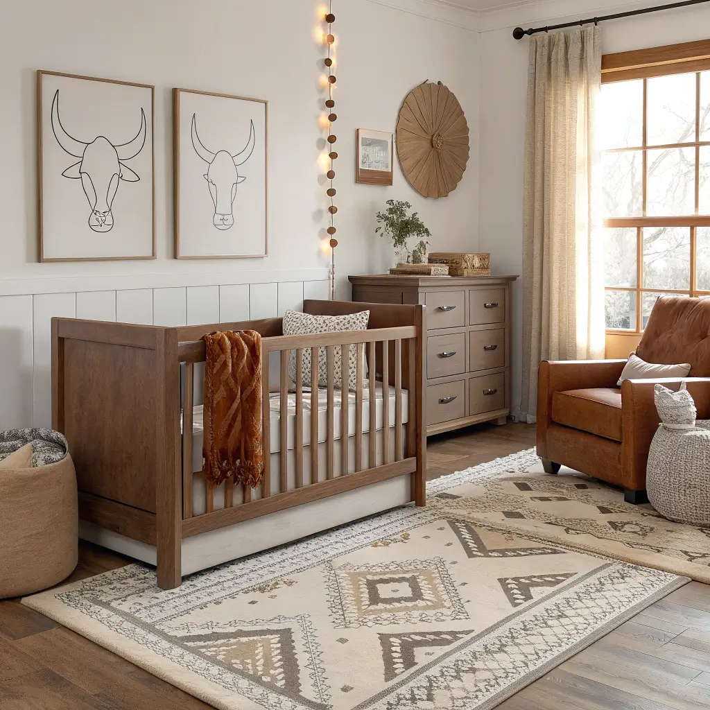 The key to nailing rustic cowboy? Mix authentic western elements with modern comfort. That vintage saddle looks amazing, but your baby needs an actual crib, not a hay bale.