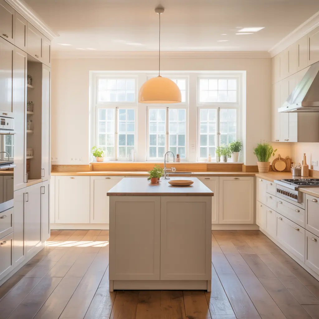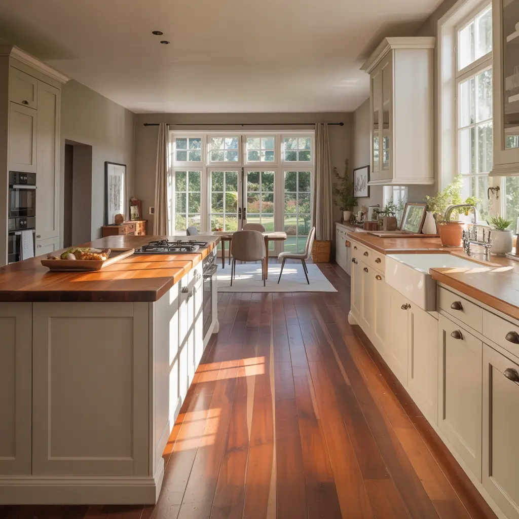White Kitchen with Warm Cherry Wood Flooring