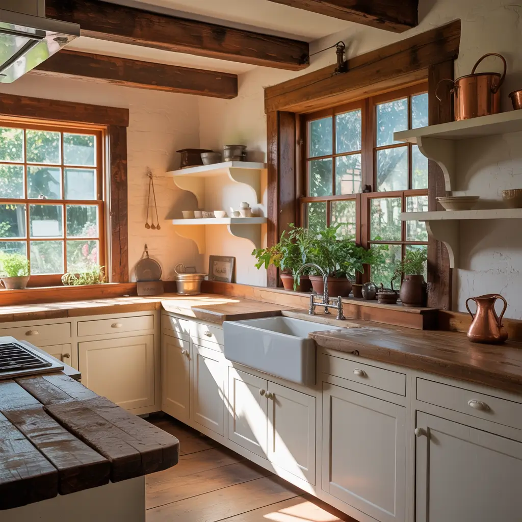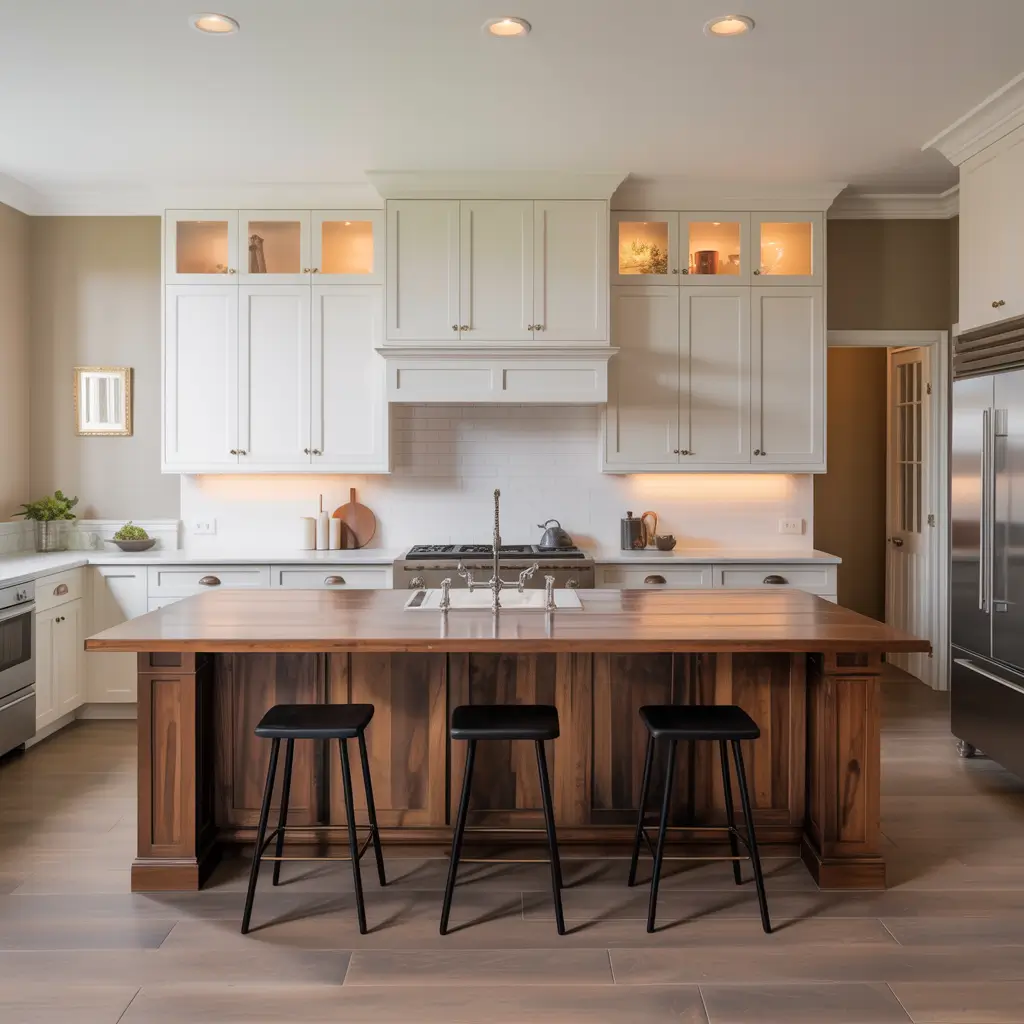 This style lets you mix wood tones (gasp!). I know, I know – design rules say match your woods. But rules are meant to be broken, right? My current kitchen has walnut lowers, white uppers, and oak open shelving. Chaos? Maybe. But it works because the white acts as a neutral bridge.
