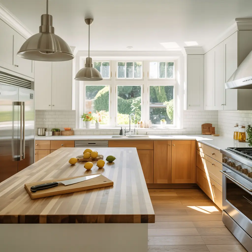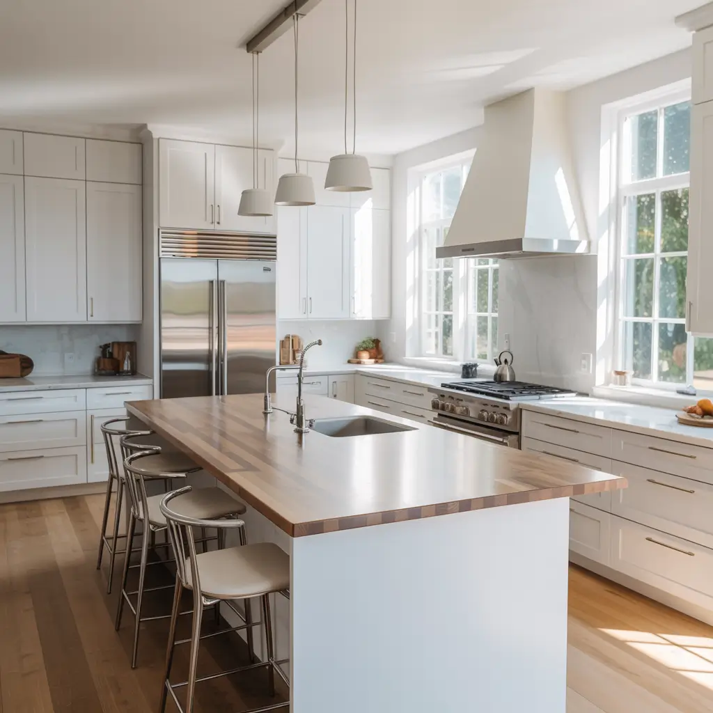 Modern White Kitchen with Light Walnut Countertops