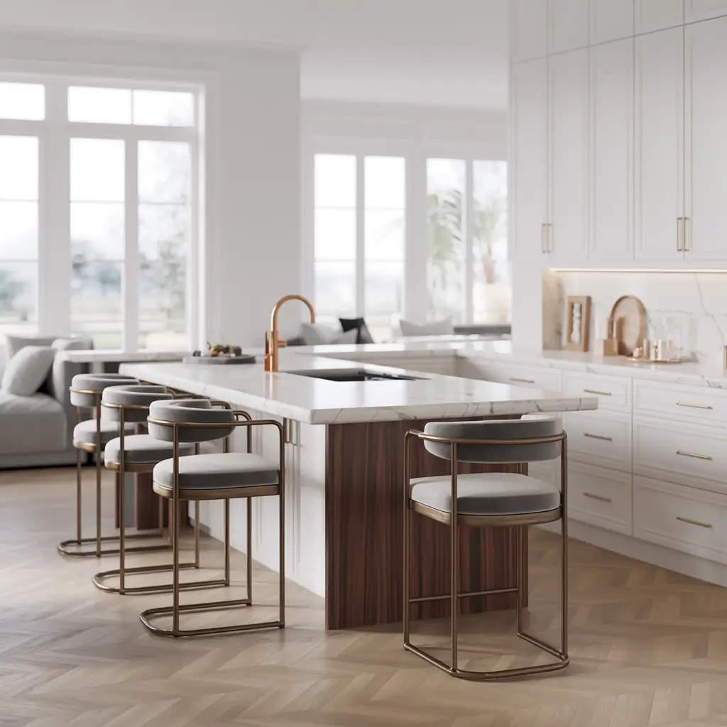 I learned this trick the hard way. My first all-white kitchen felt like a hospital ward until I added a walnut-based island. Game changer! The contrast creates a natural focal point and defines the space without walls.