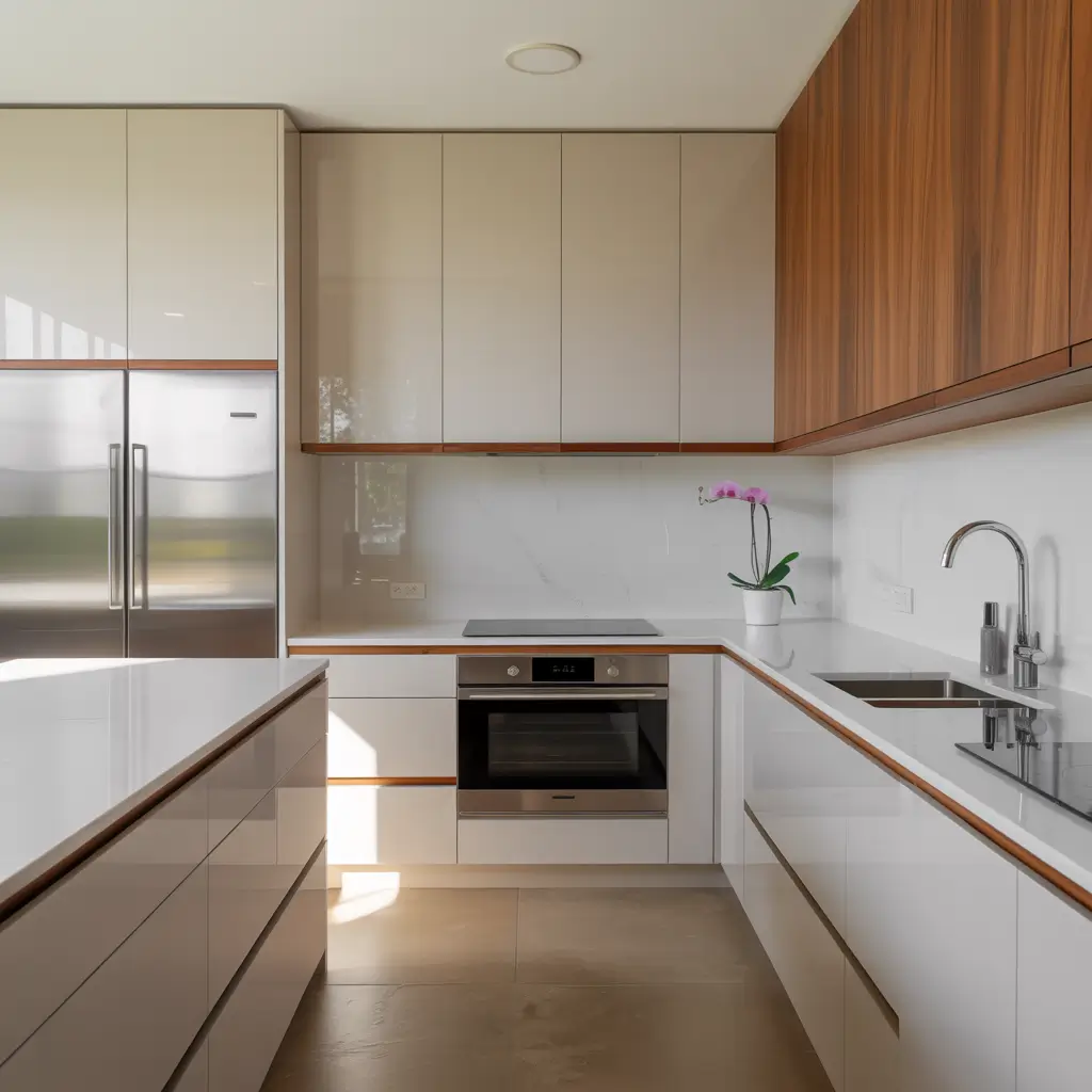 Sleek White Cabinets with Teak Wood Handles