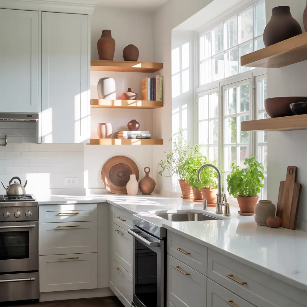 I replaced half my upper cabinets with walnut floating shelves last year. Did I have to declutter? Absolutely. Do I miss digging through packed cabinets? Not even a little bit. Everything I use daily sits pretty on those shelves, and reaching for my favorite mug feels like shopping in my own kitchen.