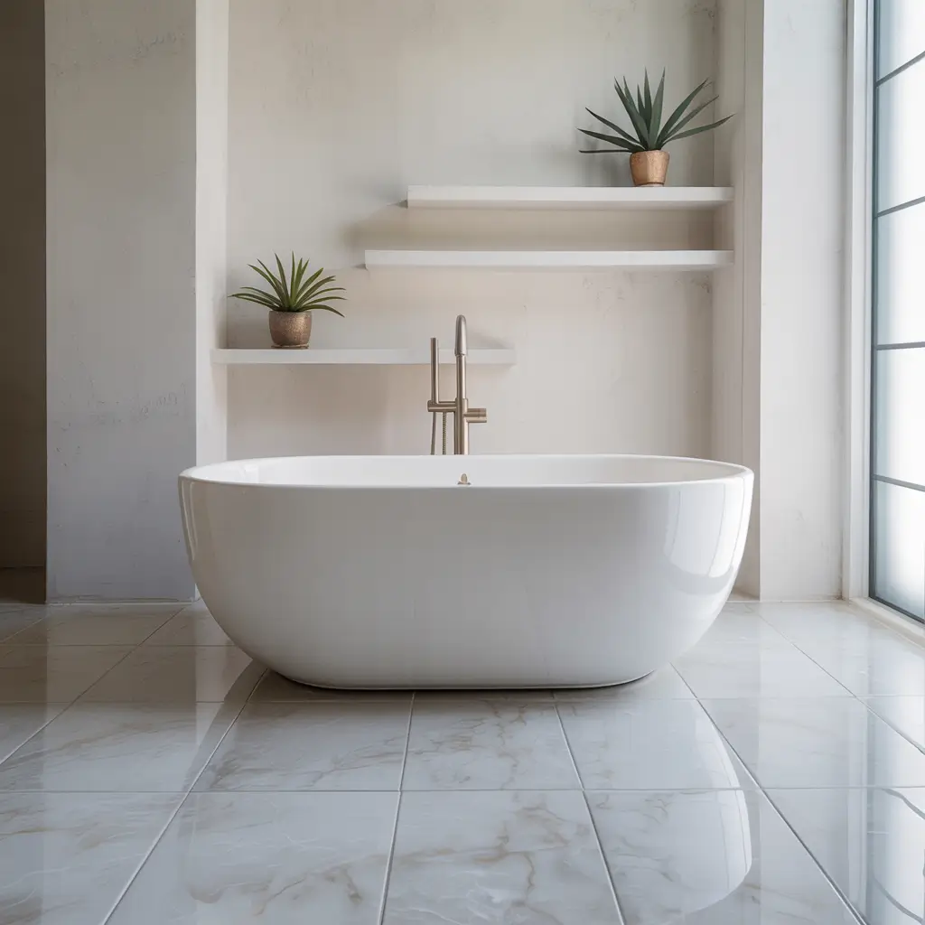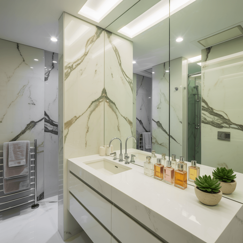 - Marble-look porcelain (budget-friendly, easier maintenance)