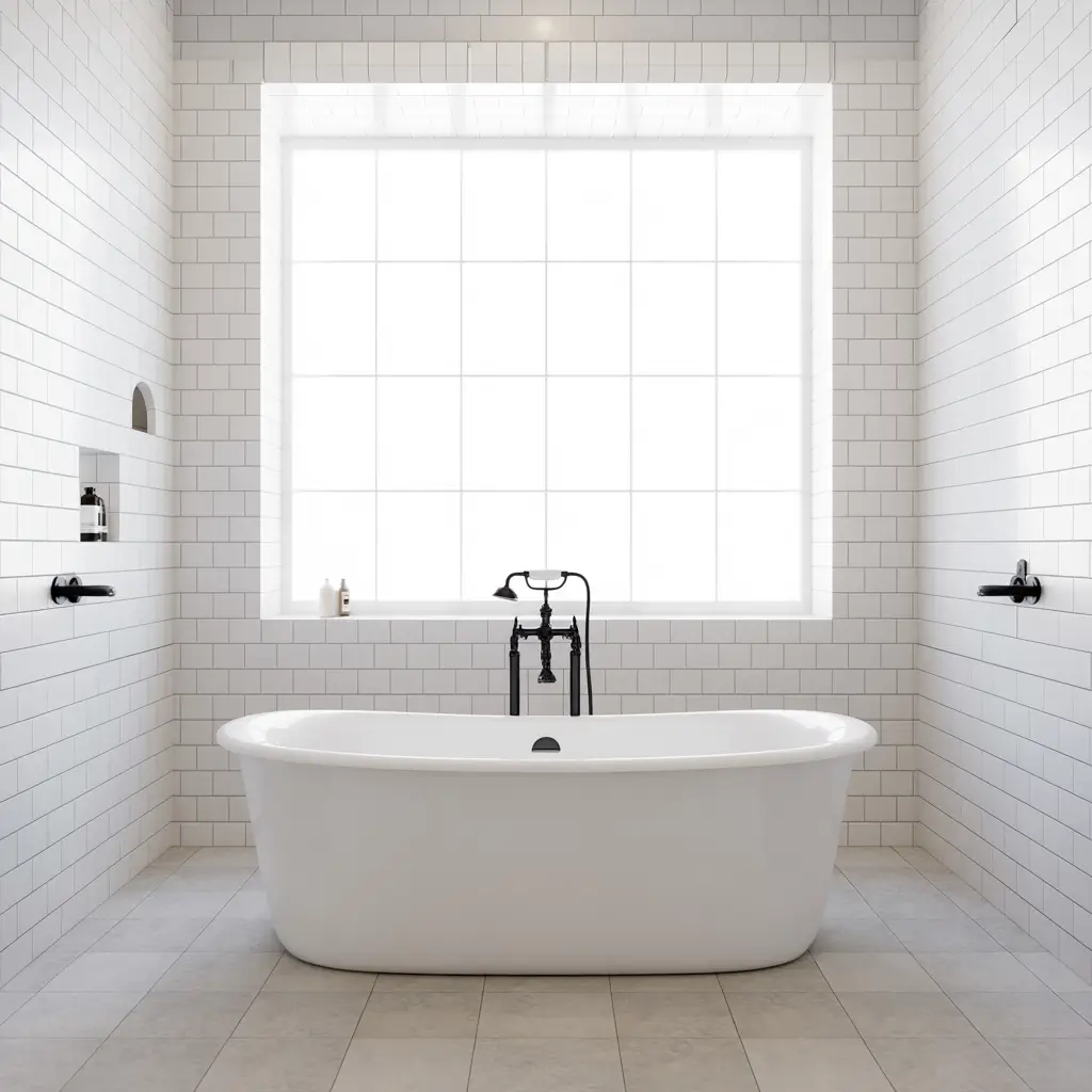 - Simple white subway or large-format tiles