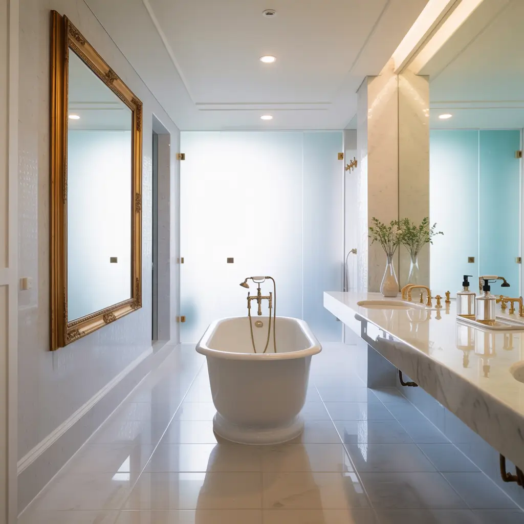 - Frameless glass shower enclosure (no chunky frames to interrupt the flow)