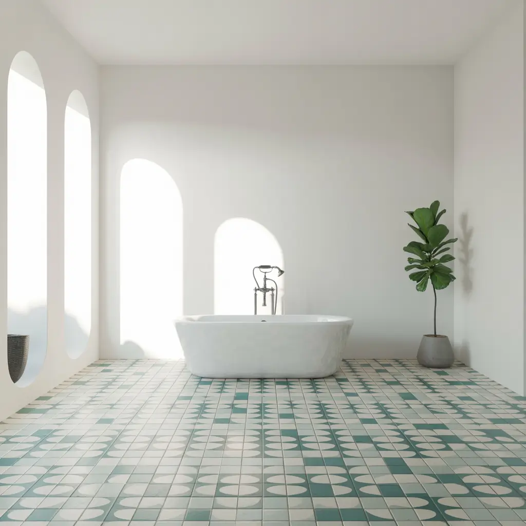 When walls and fixtures are white, patterned floor tiles become the showstopper. This is your chance to add personality, visual interest, and serious style without overwhelming the space.