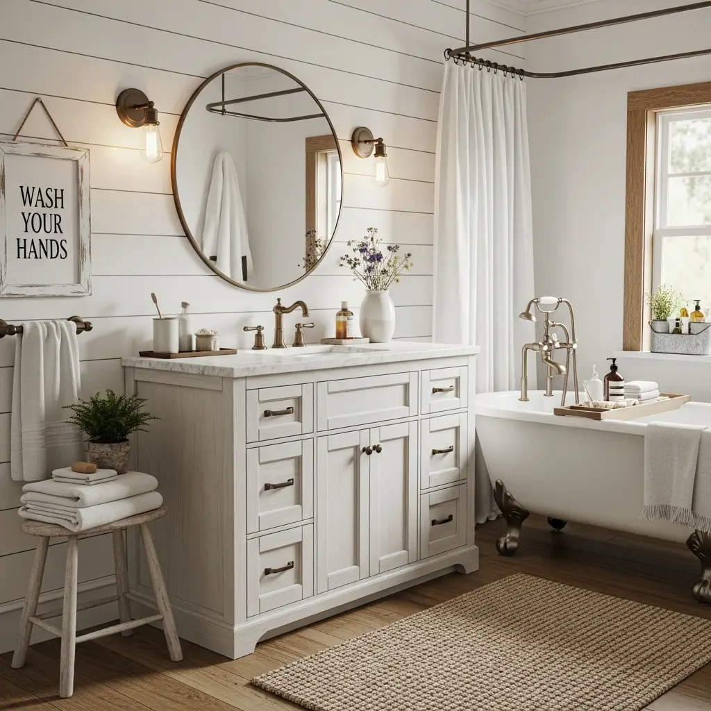 My sister’s farmhouse bathroom features a white shaker-style vanity with a marble top and oil-rubbed bronze hardware. The classic white with rustic details creates this perfect balance of elegant and approachable. Every guest comments on how welcoming and clean the bathroom feels.