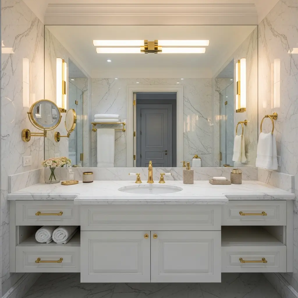 Luxury white marble vanities work because the natural stone adds texture and pattern to the white palette. You get variation and interest while maintaining that clean, bright aesthetic.