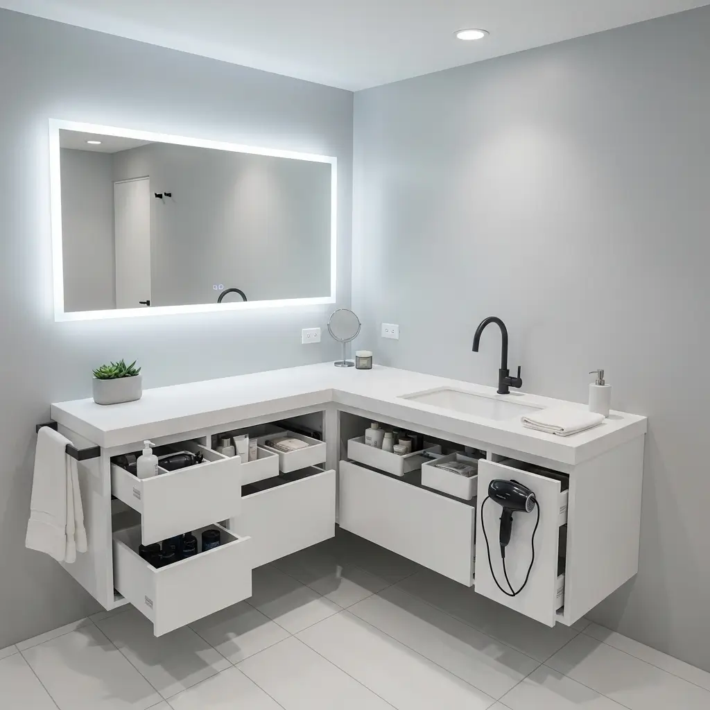 Smart storage white vanities focus on clever interior solutions that maximize function without increasing size. Every cubic inch works hard.