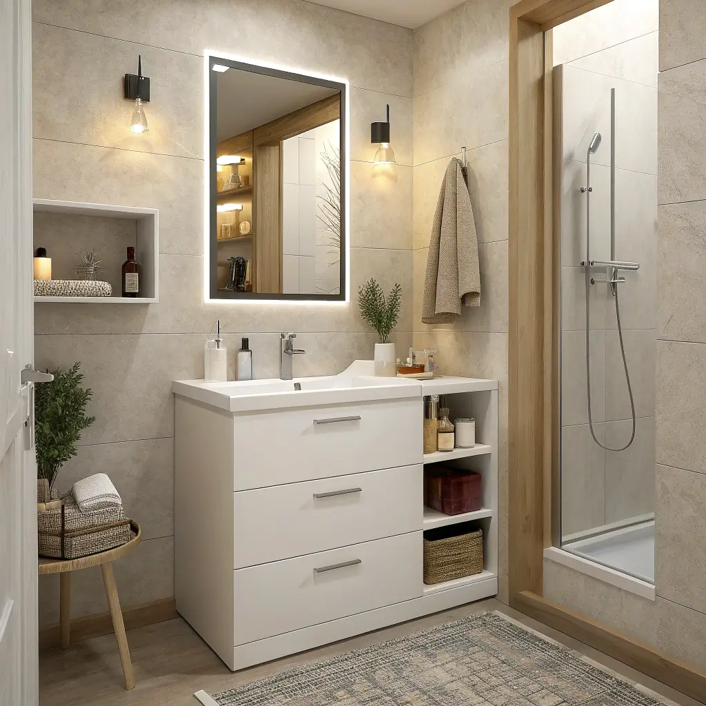 Compact white vanities with smart storage deliver function without visual bulk. The white keeps things feeling spacious even when you’re maximizing every millimeter.