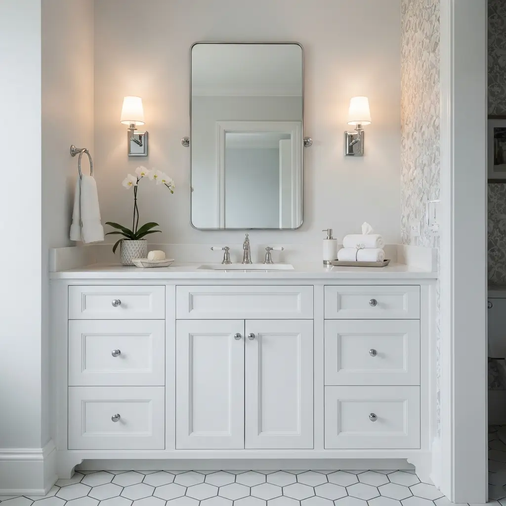 Here’s the thing about white vanities that nobody tells you: they’re not boring – they’re a blank canvas that lets everything else in your bathroom shine.