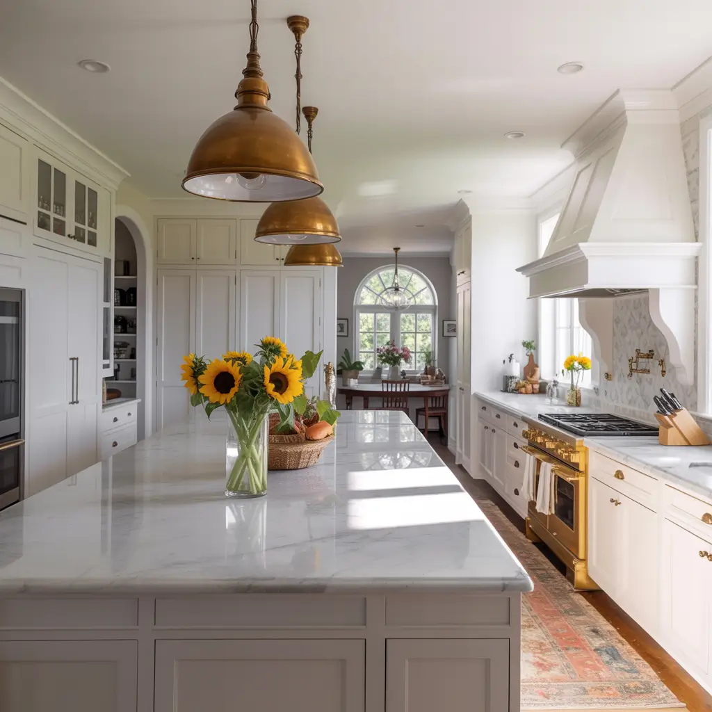 Elegant White Farmhouse Kitchen with Marble Countertops