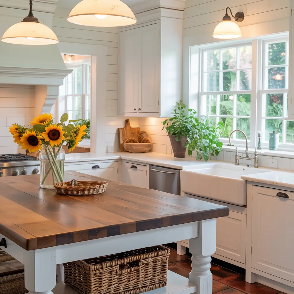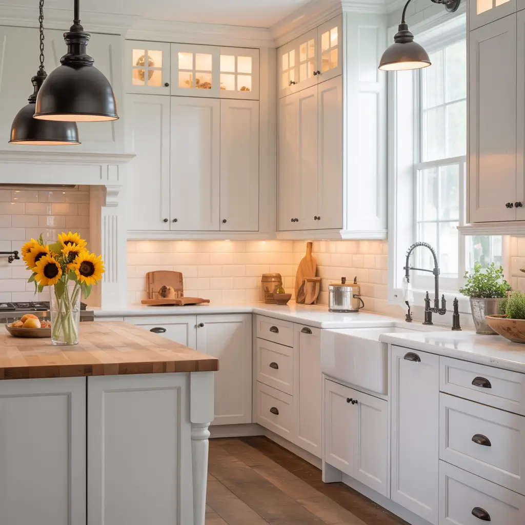 White Farmhouse Kitchen with Rustic Wooden Countertops