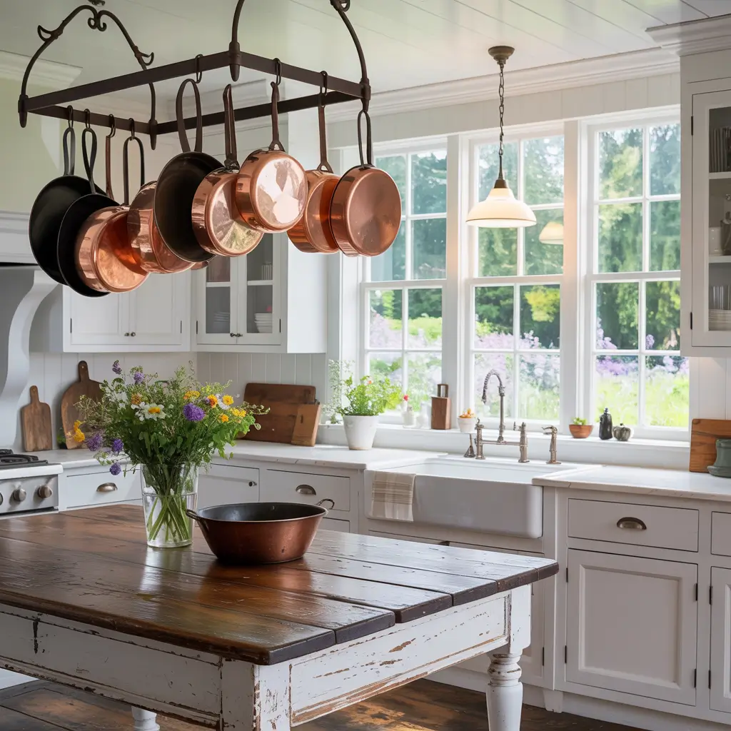 White Farmhouse Kitchen with Hanging Pot Rack