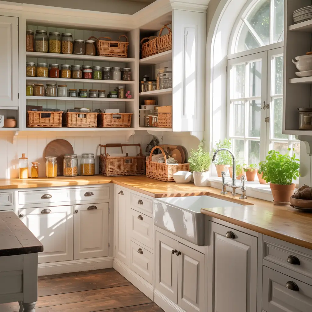 Transform a closet or corner into pantry goals with simple white shelving. Glass jars, woven baskets, and labeled containers turn basic ingredients into décor. It’s like a general store, but in your kitchen.