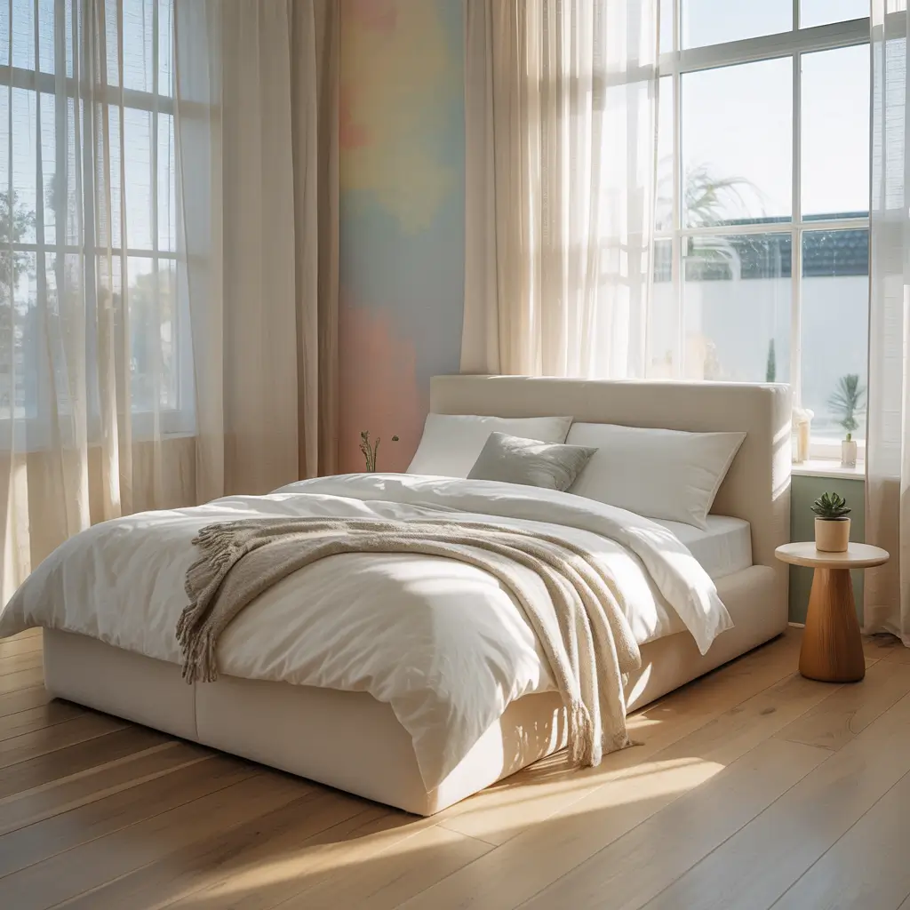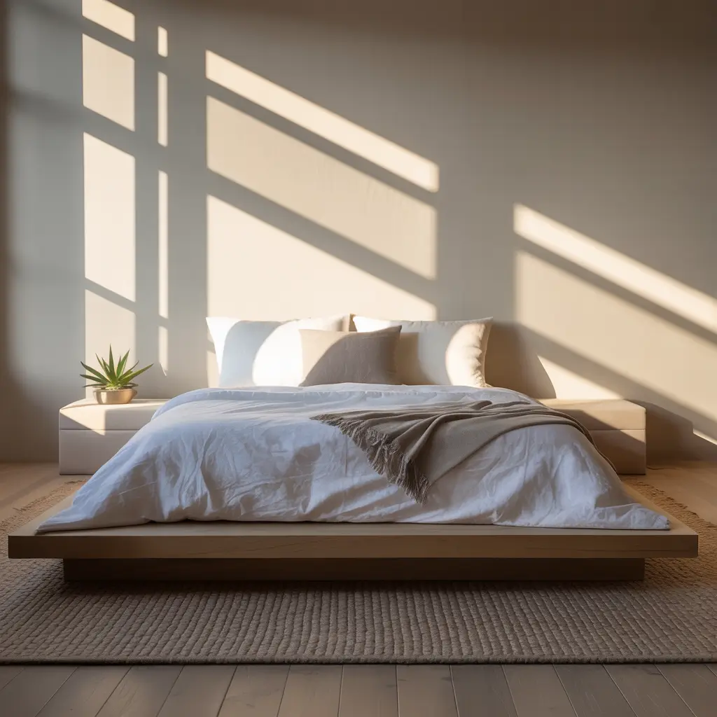 Pure white everything can feel sterile, like you’re sleeping in an Apple store. Natural accents warm things up without adding visual clutter. Think wood, rattan, jute, and plants—elements that bring life and texture while maintaining that minimalist calm.