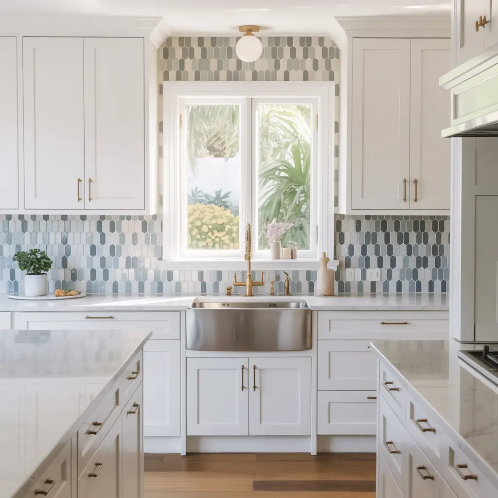 Don’t fear pattern in white backsplashes either. Geometric tiles, herringbone patterns, or even marble veining add interest. White-on-white patterns create sophistication without color commitment.