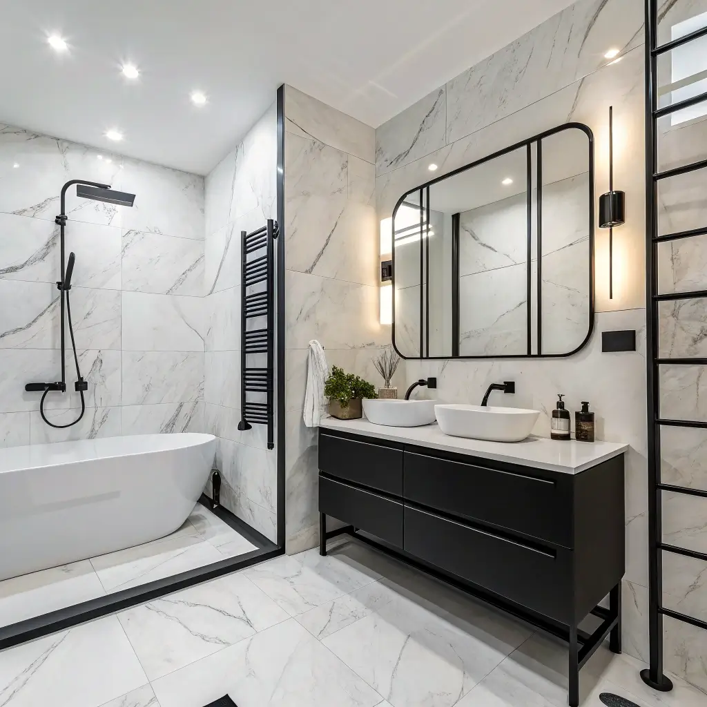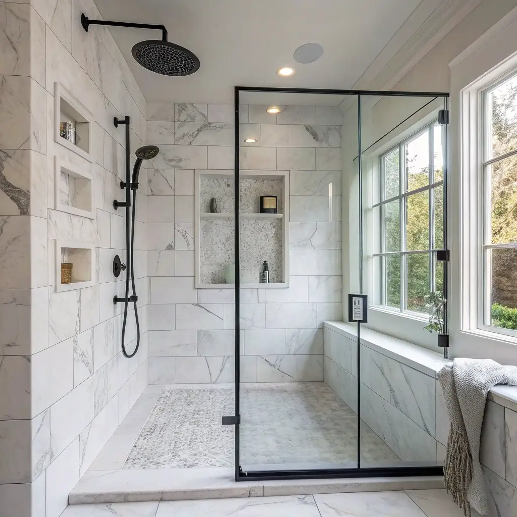 Frameless glass enclosures let your white marble tiles shine. Black metal frames can work for industrial styles, but for true modern minimalism, clear glass disappears and showcases your marble investment.