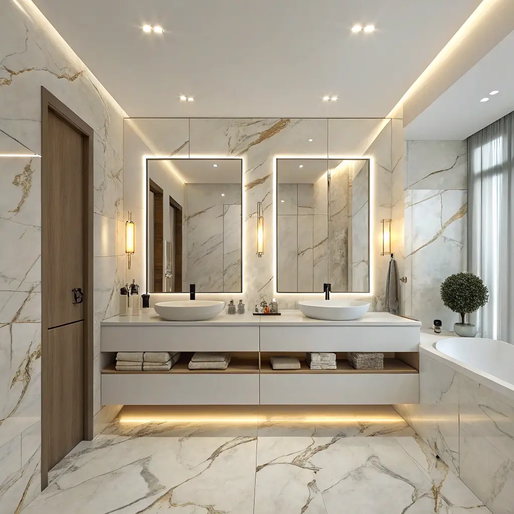 LED strips hidden behind mirrors or under vanities create ambient glow that makes white marble seem to float. I added LED strips under my floating vanity, and the soft uplight makes the marble floor look ethereal, especially at night.