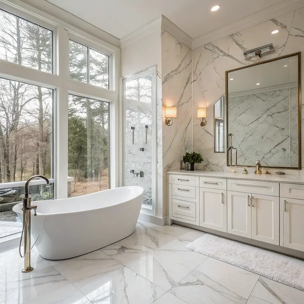 Layer different white marble finishes for depth and interest. Mix polished Calacatta on the vanity with honed Carrara on the floors. Add tumbled marble accents in the shower. The varying textures create a multi-sensory experience that elevates the entire space.